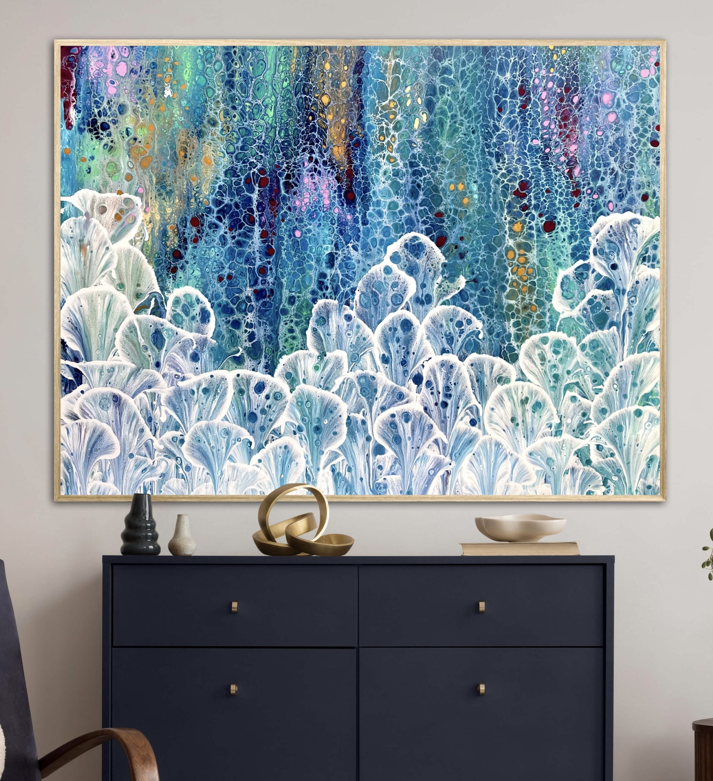 Blossom Valley is inspired by nature and depicts in abstract white Lilies growing tall and in abundance with a lush valley full of colourful flora behind. Created using various techniques combined to allow increased flow, interaction and separation of colours to create interesting patterns where pops of colour can be seen emerging from underneath. This added dimension adds lace and cells to the artwork creating an interesting and one of a kind painting that can never be replicated.
