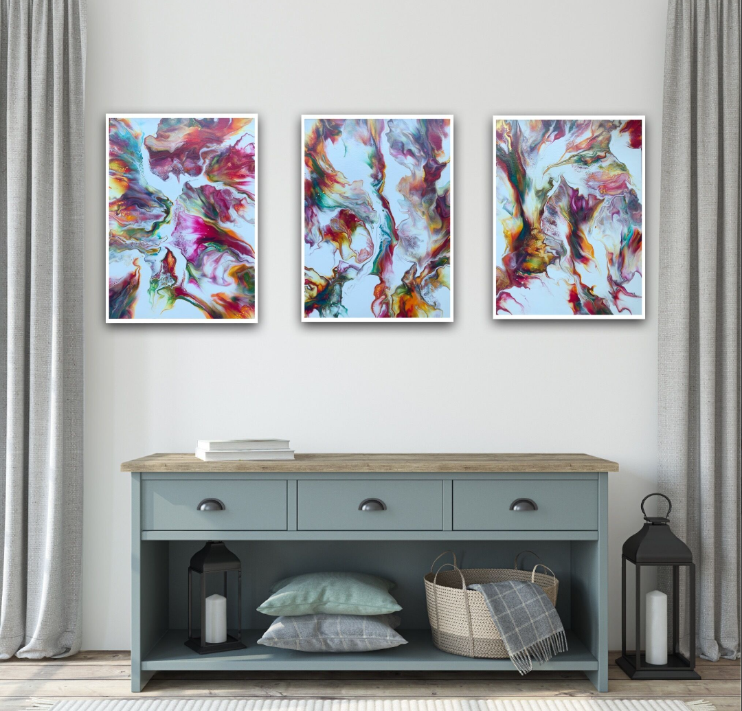 Bring colour, movement, and joy into your home with Blossoming Hues — a vibrant triptych that dances across the canvas in a celebration of colour. This original fluid artwork features an uplifting palette of pinks, magentas, sunny yellows, oranges, turquoise, greens, and shimmering metallic gold on a white background.