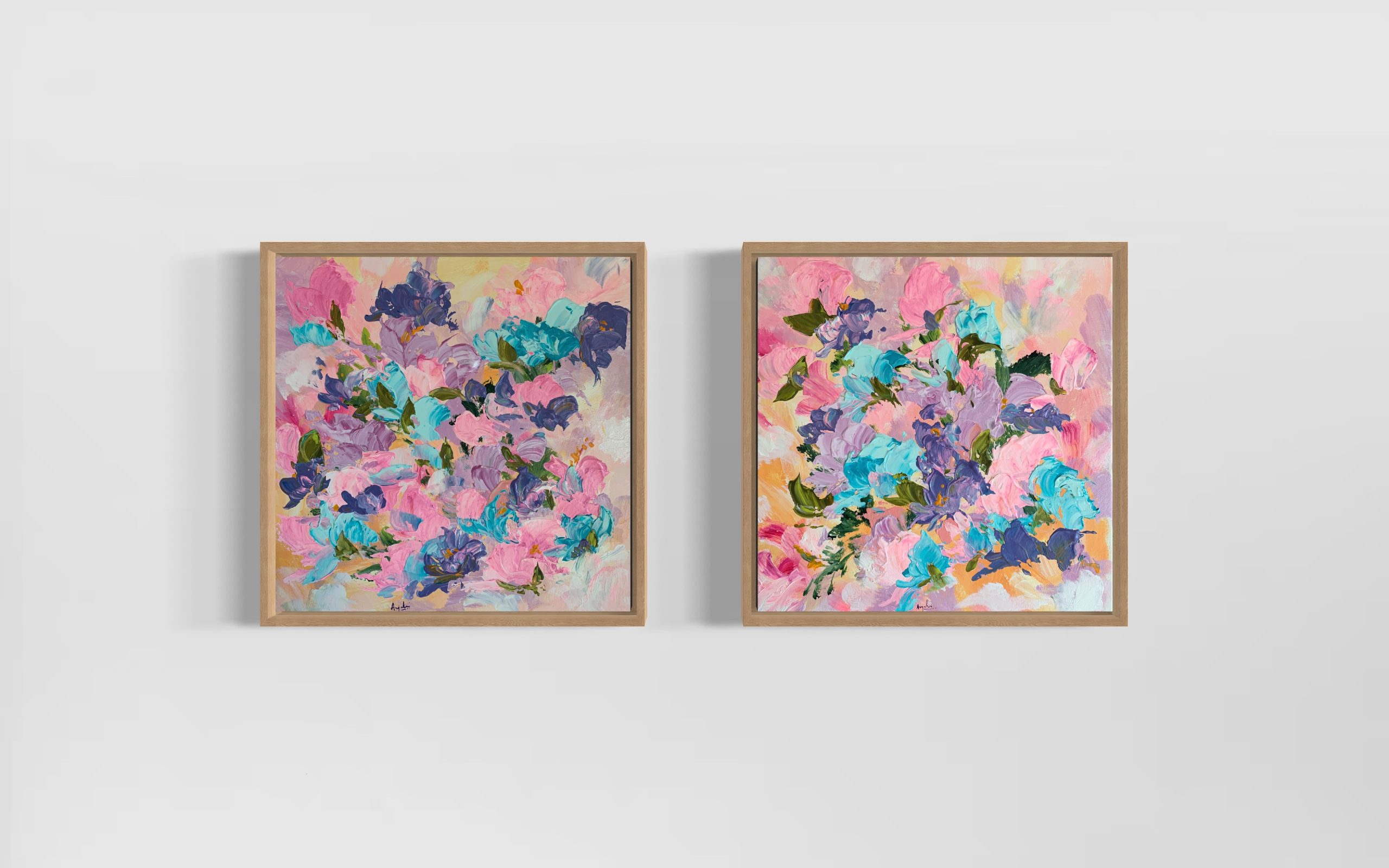 In “Blossoming Reverie,” a captivating diptych series framed in elegant oak floater frames, I explore the enchanting world of colorful floral abstraction. This collection is an ode to the inherent beauty found within the intricacies of nature’s floral tapestry. Through the harmonious interplay of pastel pink, magenta, purple, yellow, pastel blue, and white, I aim to evoke a sense of delight and wonder, inviting viewers into a dreamlike realm of vibrant emotions.