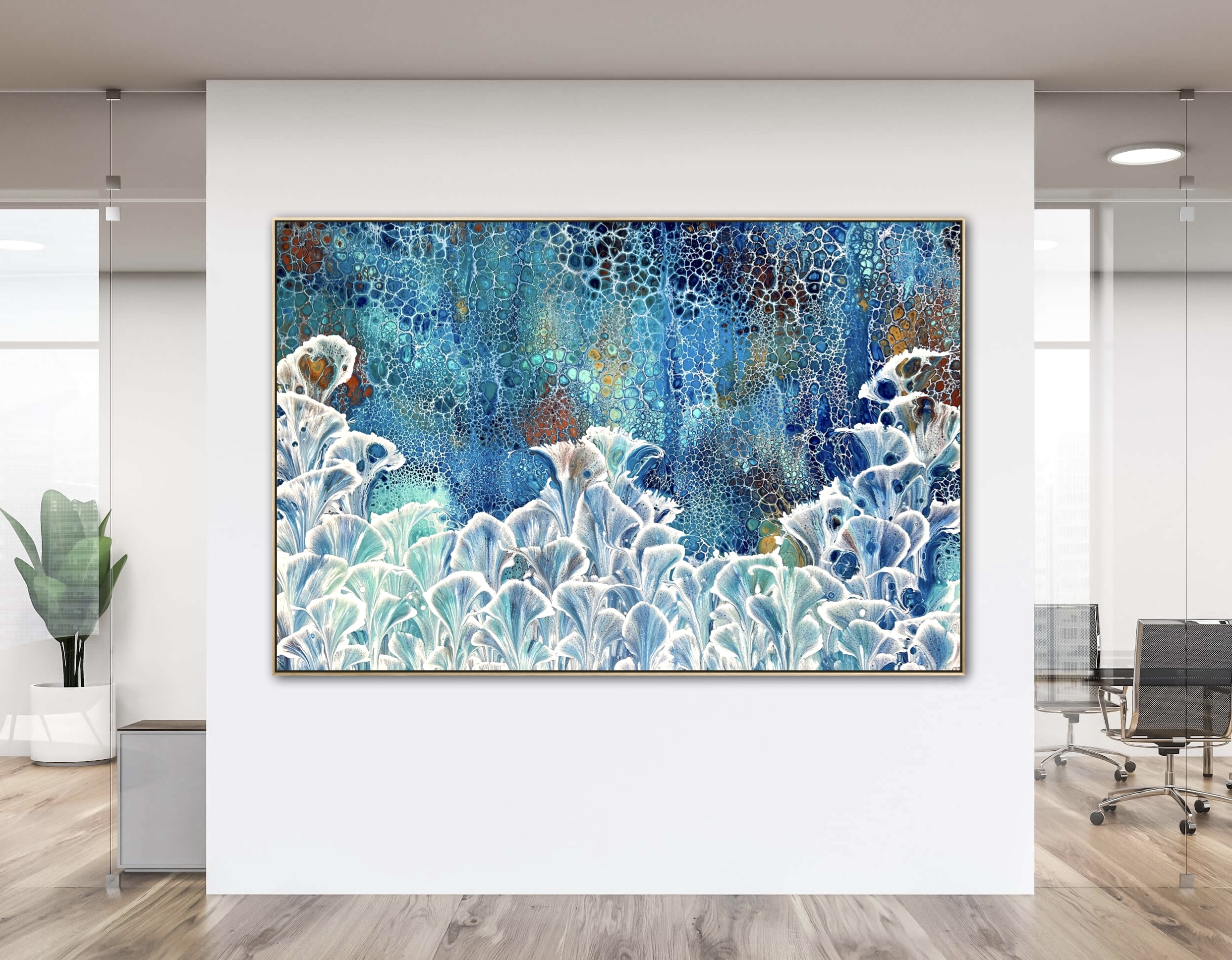 Blossoming Valley is inspired by nature and depicts in abstract Calla Lilies growing tall and in abundance with a lush valley full of colourful flora behind. Created using various techniques combined to allow increased flow, interaction and separation of colours to create interesting patterns where pops of colour can be seen emerging from underneath. This added dimension adds lace and cells to the artwork creating an interesting and one of a kind painting that can never be replicated. The metallic gold and copper used in this painting reflect the changing light beautifully really bringing the painting to life.