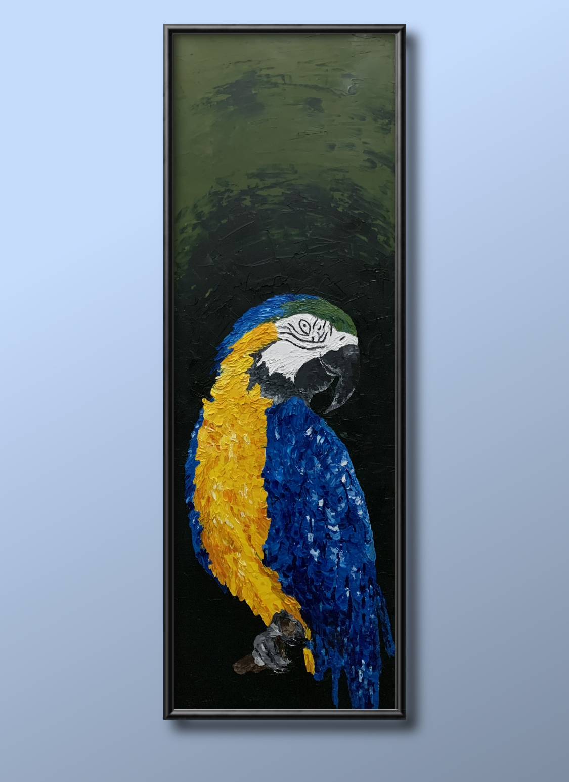 Blue and Gold –Â Original artwork by Anjana Rai – The blue-and-yellow macaw, also known as the blue-and-gold macaw, is a large South American parrot with mostly blue top parts and light orange underparts, with gradient hues of green on top of its head. I saw one while I visited the Adelaide zoo. I was mesmerized by its beauty. The beautiful yellow and blue feathers , black shiny eyes and beautiful long claws. I have tried to capture the beauty of this beautiful creature in my signature style. This artwork is made using impasto technique with palette knife and is framed in solid black frame, ready to hang. Unframed dimensions are 30.5 x 91.4 x 3.5 cm.
