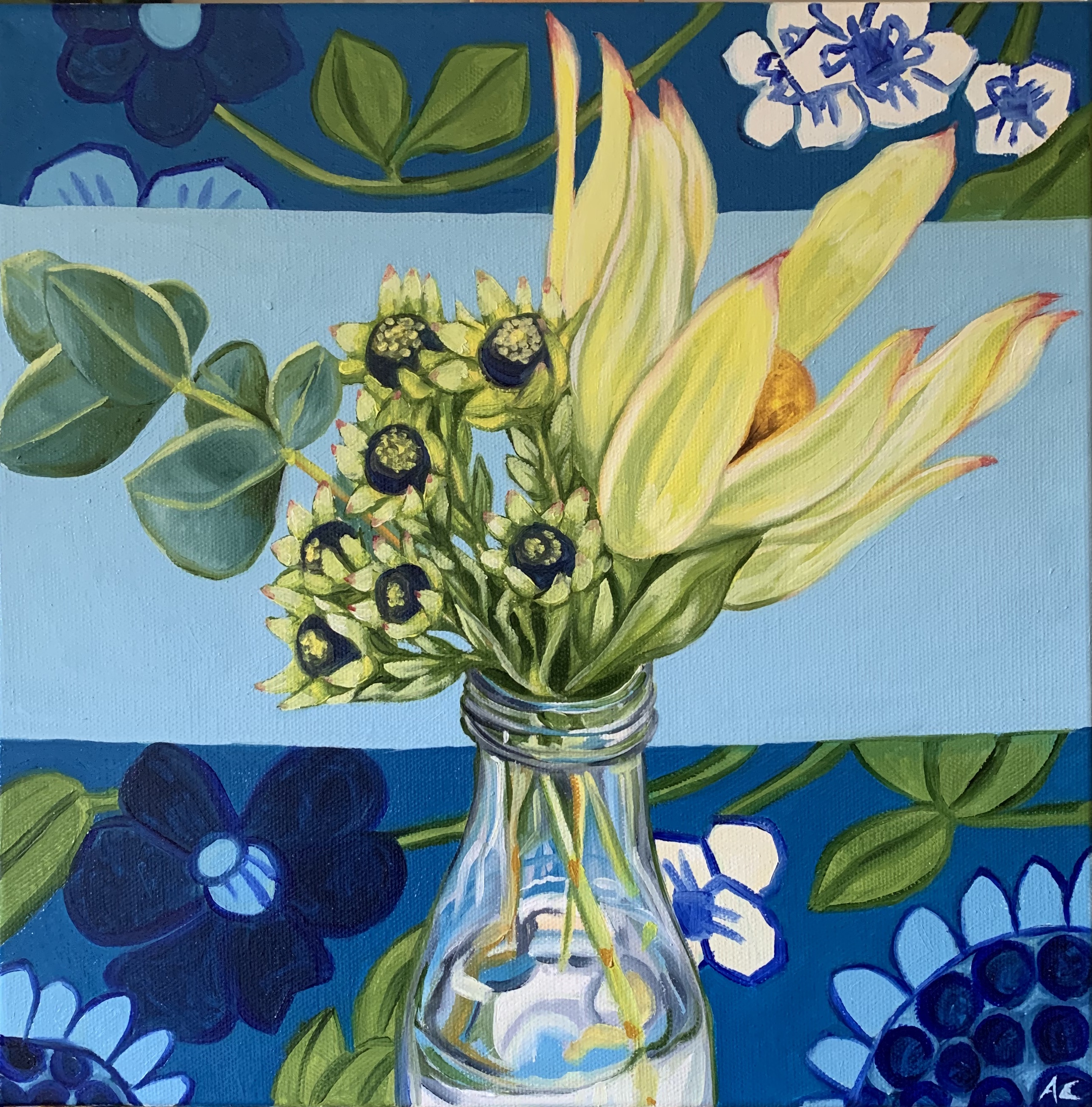 Measuring 30.5cm (W) x 30.5cm (H) x 3.5cm (D) (unframed), this is an original oil painting on stretched canvas featuring a vase of Leucadendrons and Penny Gum leaves.