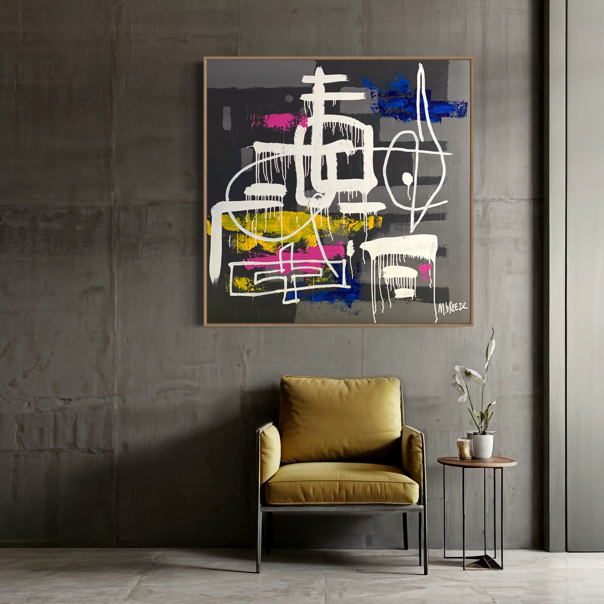 Original artwork using acrylic paints applied with trowel, brush and hands on to stretched canvas in Oak Frame