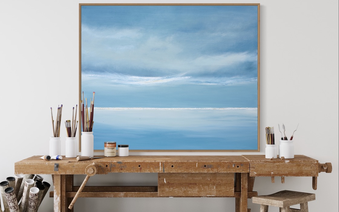 This painting was inspired by calm, lazy days by the ocean when the temperature was perfect. It has a laid-back vibe and would suit any room that needs a bit of calming influence. It’s also good for coastal-style decor. My main focus was to create a peaceful, happy feeling—the special way the sky and water make you feel when you visit the ocean.