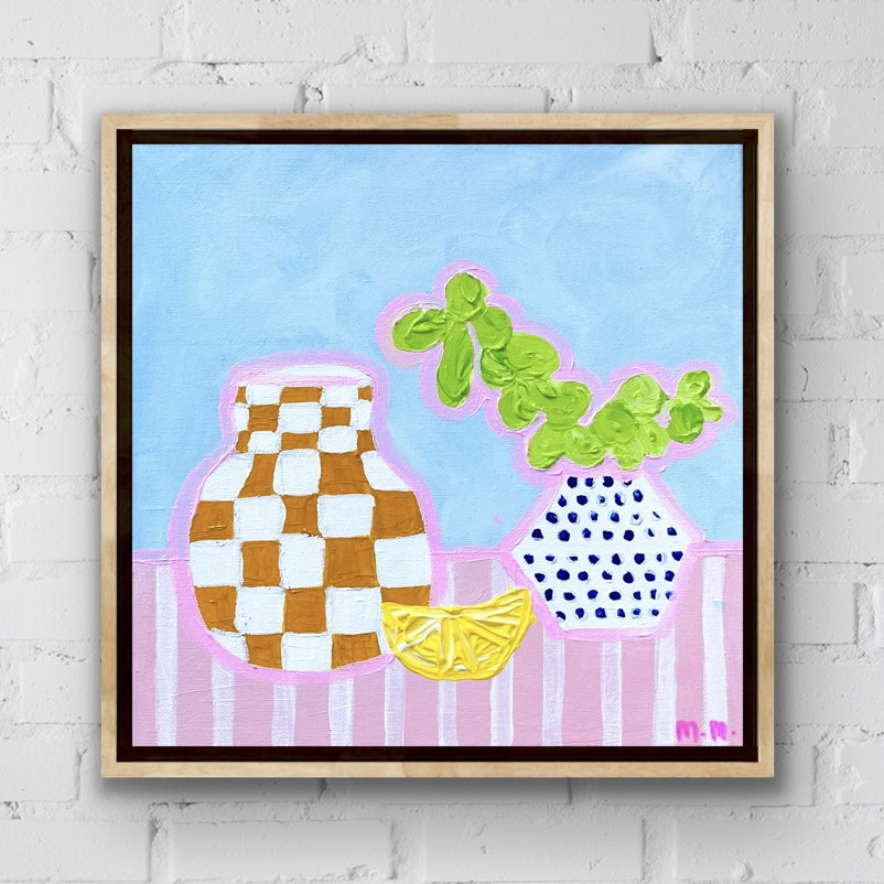 Blue Dotty Pot on Pink Stripes With Lemon by Maggi McDonald – Leaning into painting some still life for the first time since art class in school over 30 years ago now.