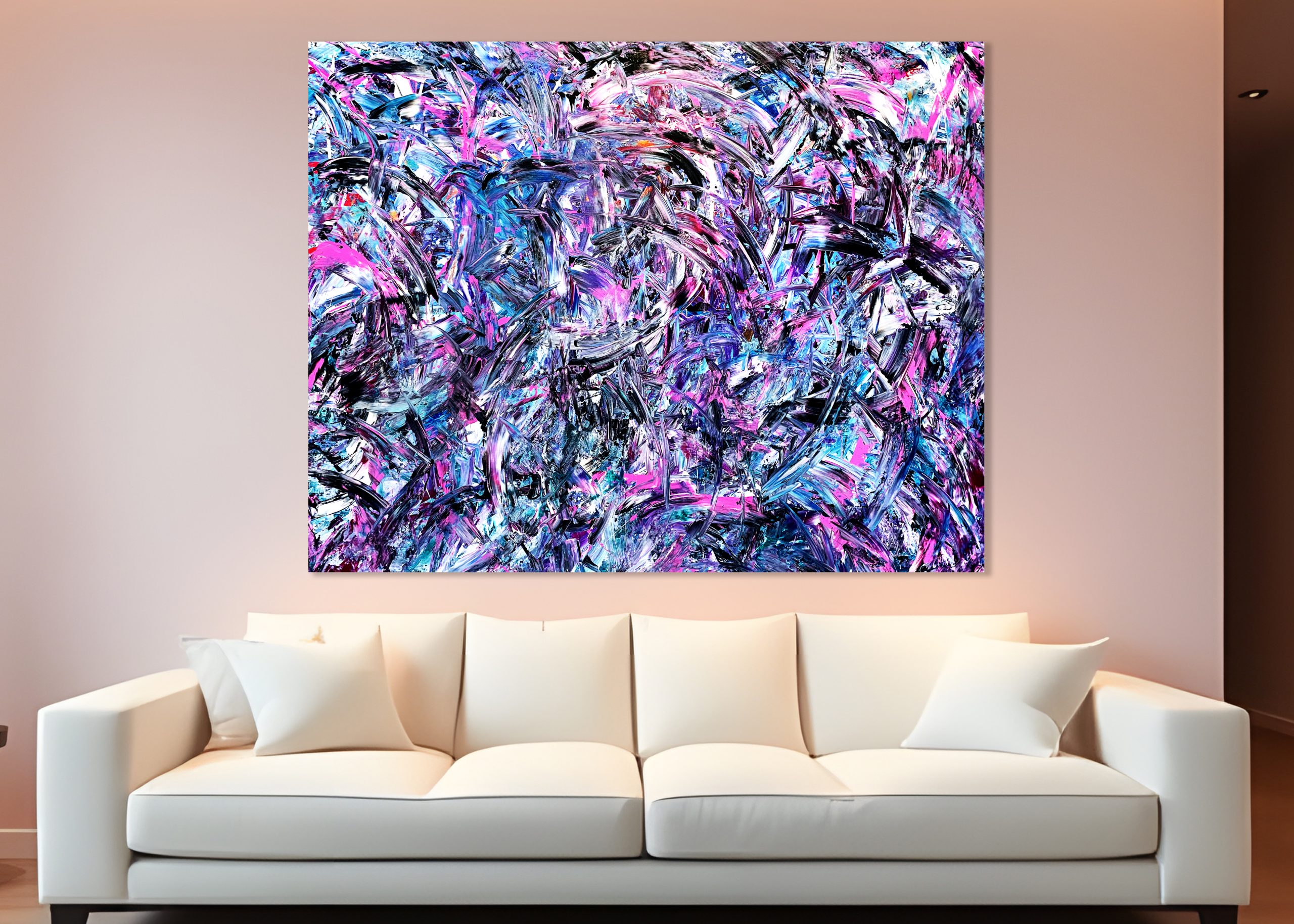 This artwork is painted on professional-grade canvas, stretched, and sealed with varnish. The canvas measures 140 cm in width by 110 cm in height. The painting is painted in the same manner as the surface on the sides, giving it a colour wrap.
