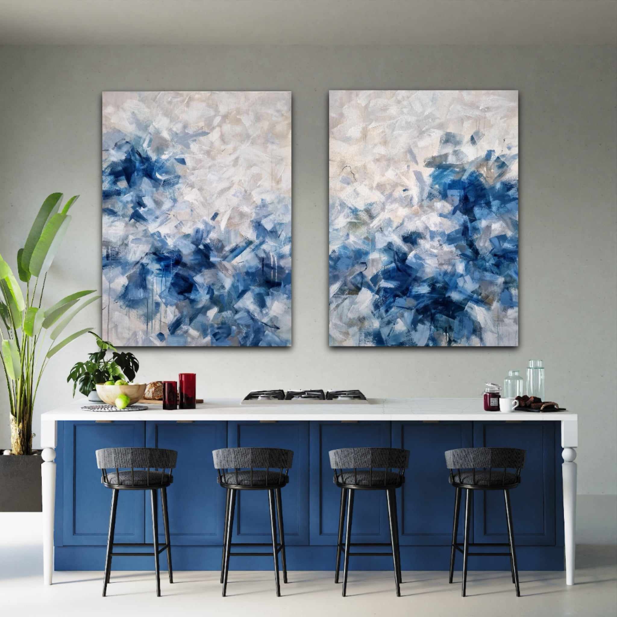This listing is for a diptych. Each piece measures 91x122x4 cm. They can be hung next to each other or separated—for example, along the stairway or a long wall, on each side of the door, or on different panels. They also can be displayed horizontally or vertically. I believe this flexibility is an incredible advantage.