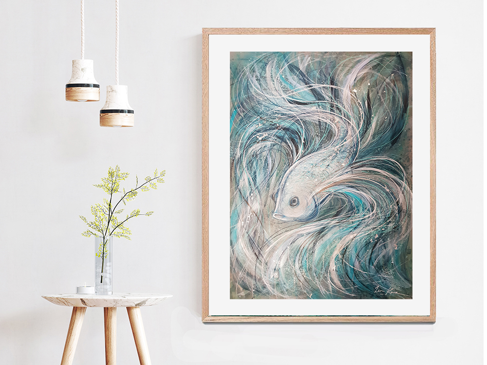 Mixed Media Painting on 300gsm paper. Acrylic paint, ink, pastel, silver foil on paper. UNFRAMED. This grey and blue Betta fish painting symbolizes individuality, strength, and a defiant spirit. Loose linework is used to capture movement and a sense of freedom.