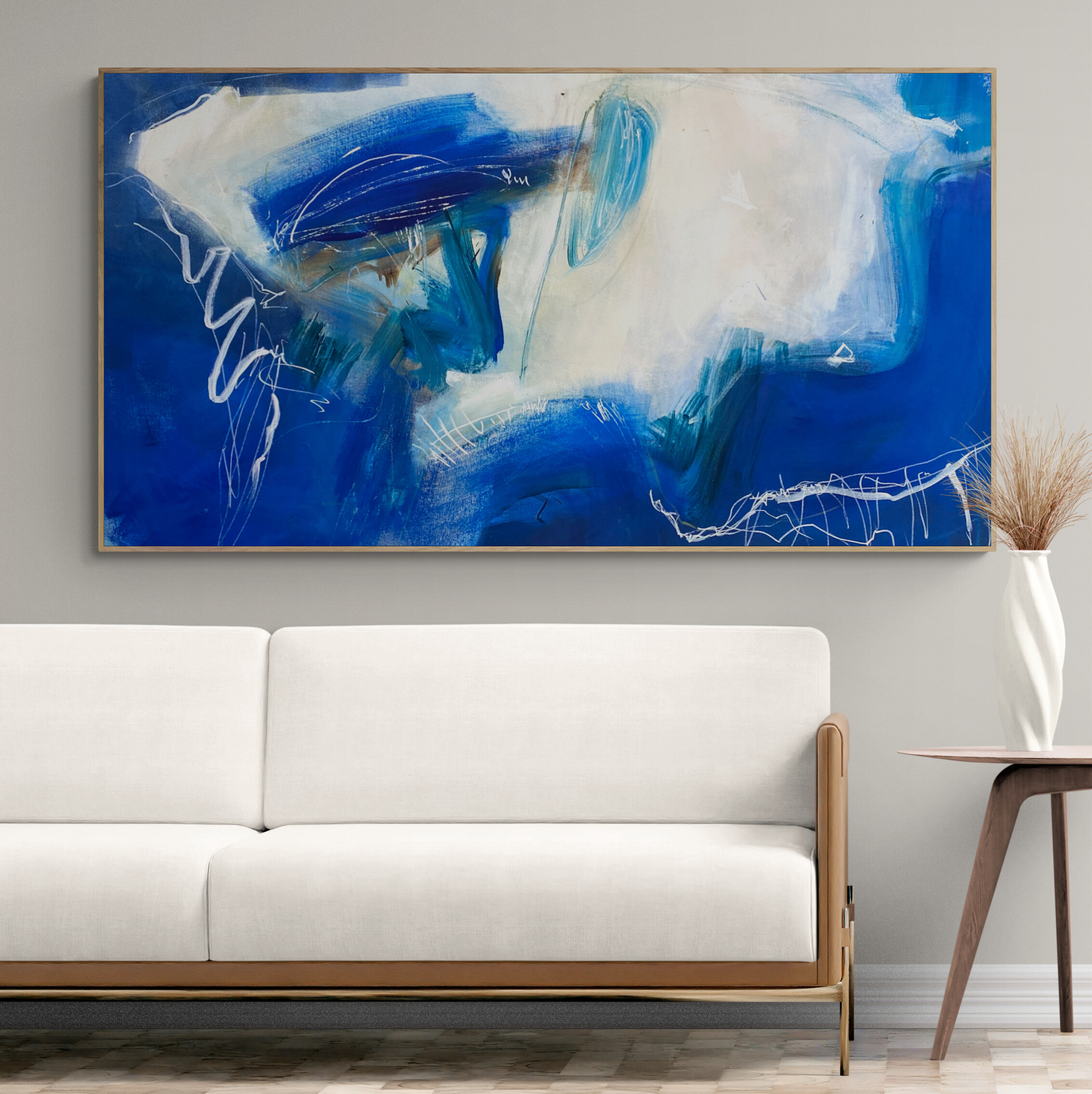 Blue Harbour is a beautiful abstract expressionist statement piece perfect for any large space. Its vibrant palette of light and royal blue, teal and white combined with bold expressionist mark-making suggestive of harbour boats, huts and bridges makes this painting come alive.