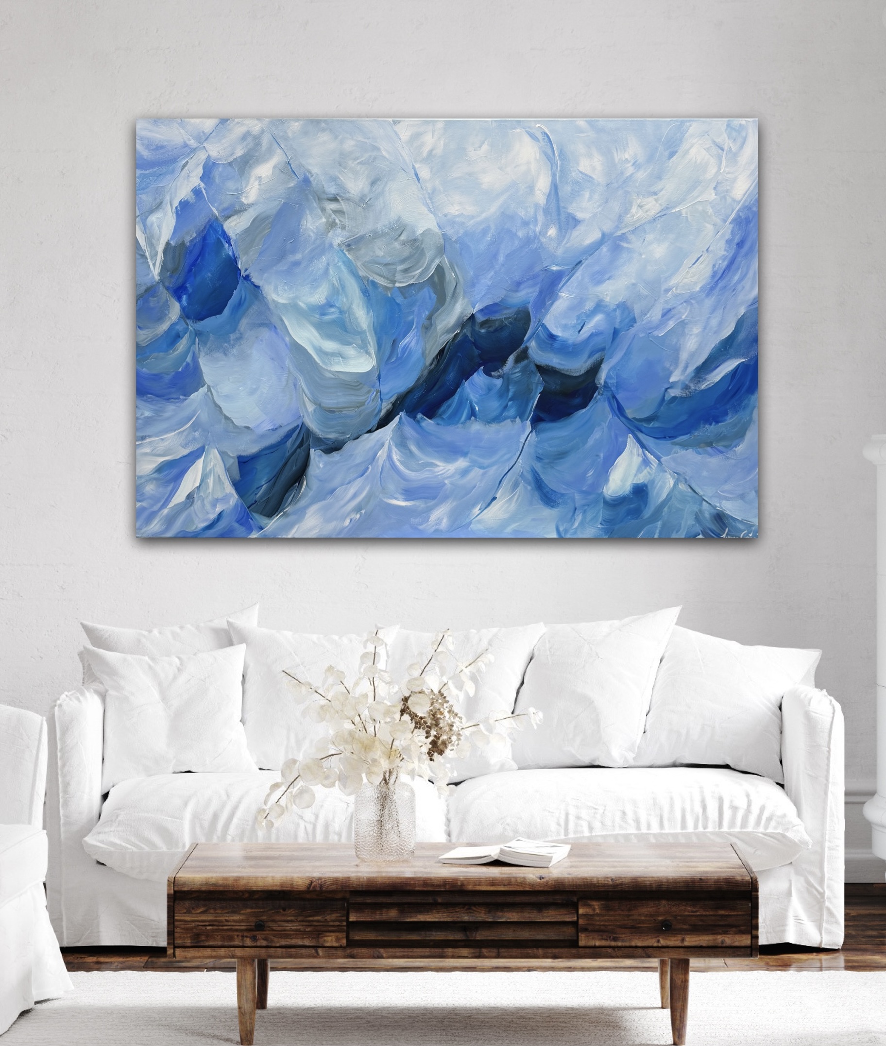 This striking artwork ‘Blue Haven’ captivates with its vibrant and intense blue tones. This artwork showcases layers of different shades of blue, with a dynamic play of light and depth creating an oceanic sanctuary.