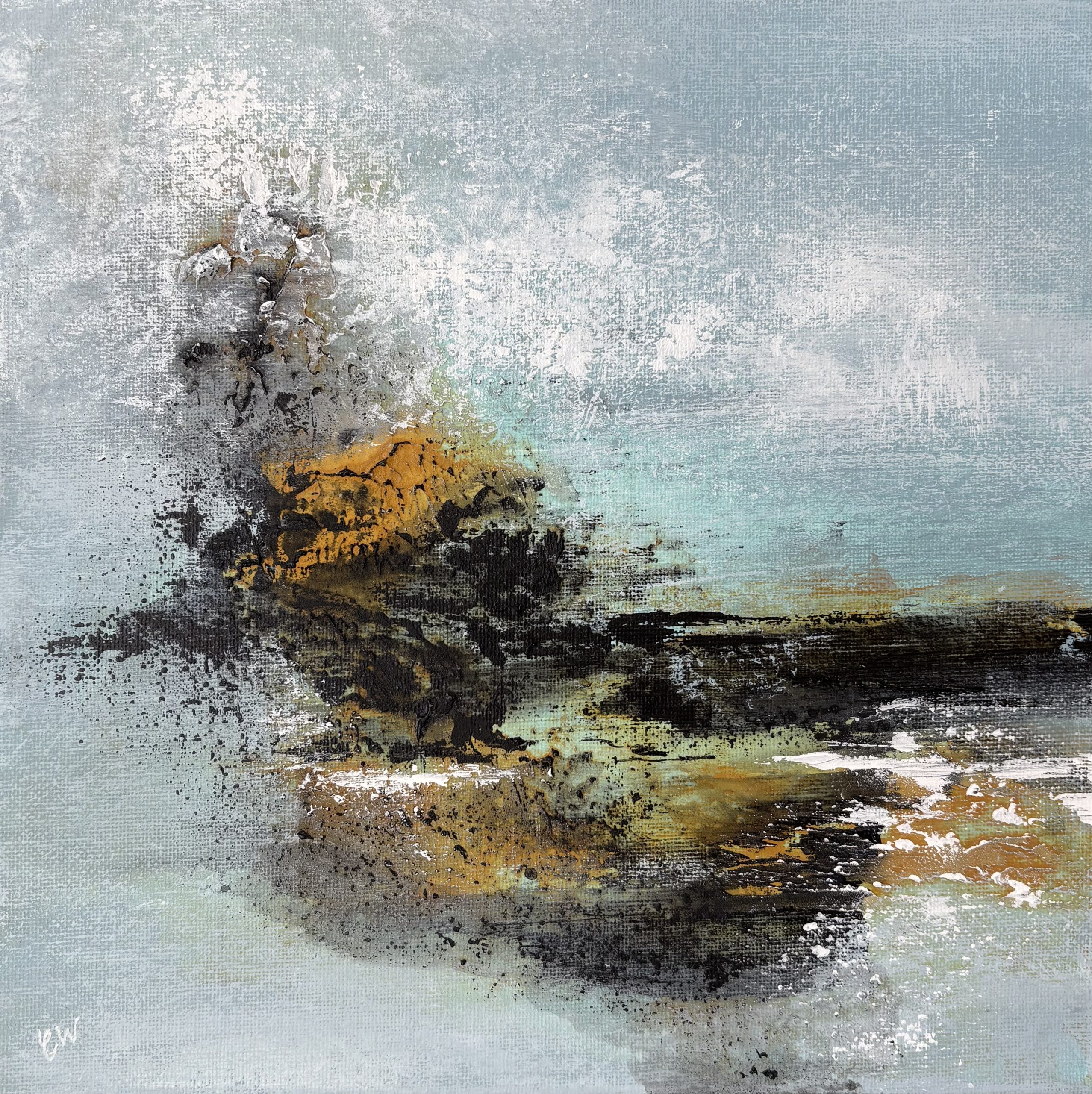 This piece is a beautifully textured abstract landscape/seascape.