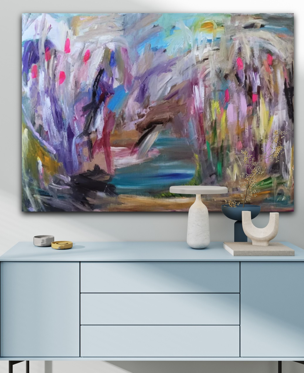 Abstract painting on stretched canvas, inspired by beautiful nature. Blue Lagoon in a Forest, hidden from everyone.