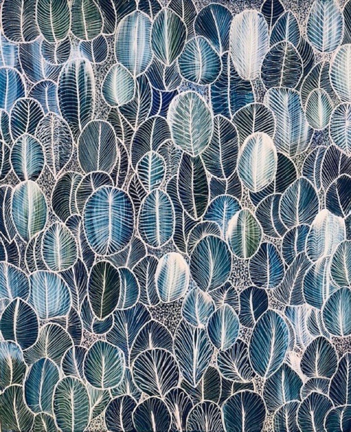 Original hand painted abstract art. Thick acrylic paint applied using a large brush allowing for the large strokes. White lines added to follow the outline of the brush strokes forming the leaves. Detailed patterns to each leaf. Shades of blues, aquas and greens.