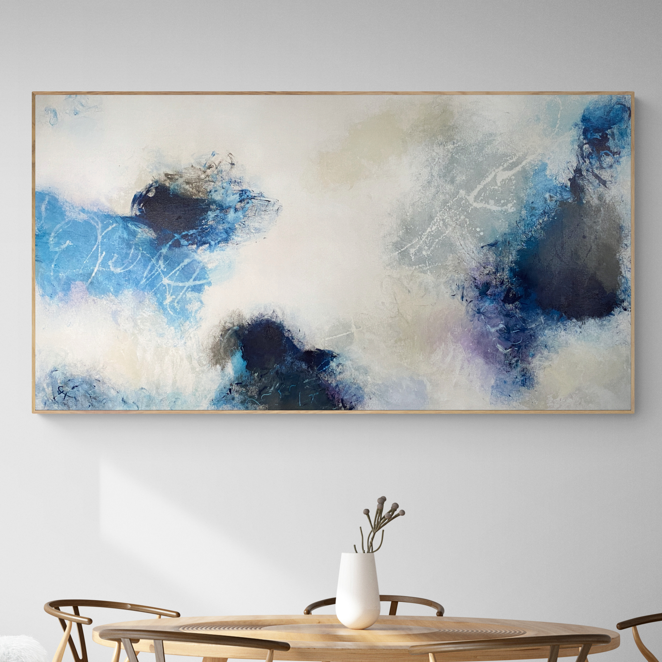 Blue Mountains by Cheryl Harrison – This is an original abstract painting with intriguing mark making and a subtle calming palette of warm ochre, violet and grey tones with beautiful splashes of light and dark blues, to make it pop!