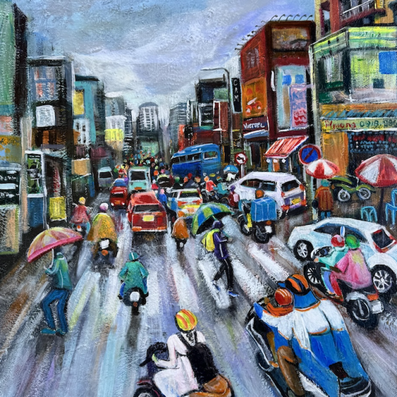 Blue Rain Carnation by Leni Kae – In this artwork by Sydney artist Leni Kae, a nude holds a blue carnation flower to represent finding truth, and her long hair flows to represent the strength and freedom of discovery. Her hair falls like fluid, water, rain . It is symbolic of introspection and reflection; the freedom that comes from discovery and truth. Oil on canvas, fixed to board, framed. Includes a white exterior frame. Ready to hang.