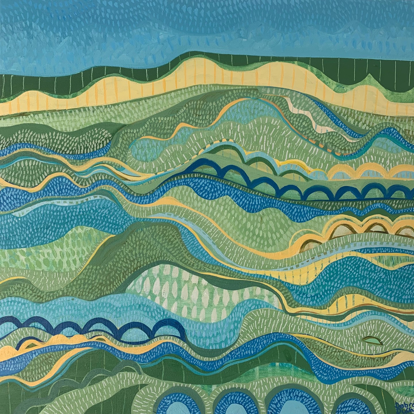 This artwork is an original abstract style landscape, using contrasting patterns and bright bold colours as my focus. This artwork is an extension of my current interest in using patterns and shapes to form its own story and to captivate the viewer. My home at the foothills of the Blue Mountains and at the doorstop of the Nepean River continues to be a form of inspiration especially in this artwork. Acrylic paint and artist markers was used on thick edge stretched canvas finished with varnish for protection. This painting is ready to hang with D hooks and picture wire and signed on the front and back. A certificate of authenticity is also included.