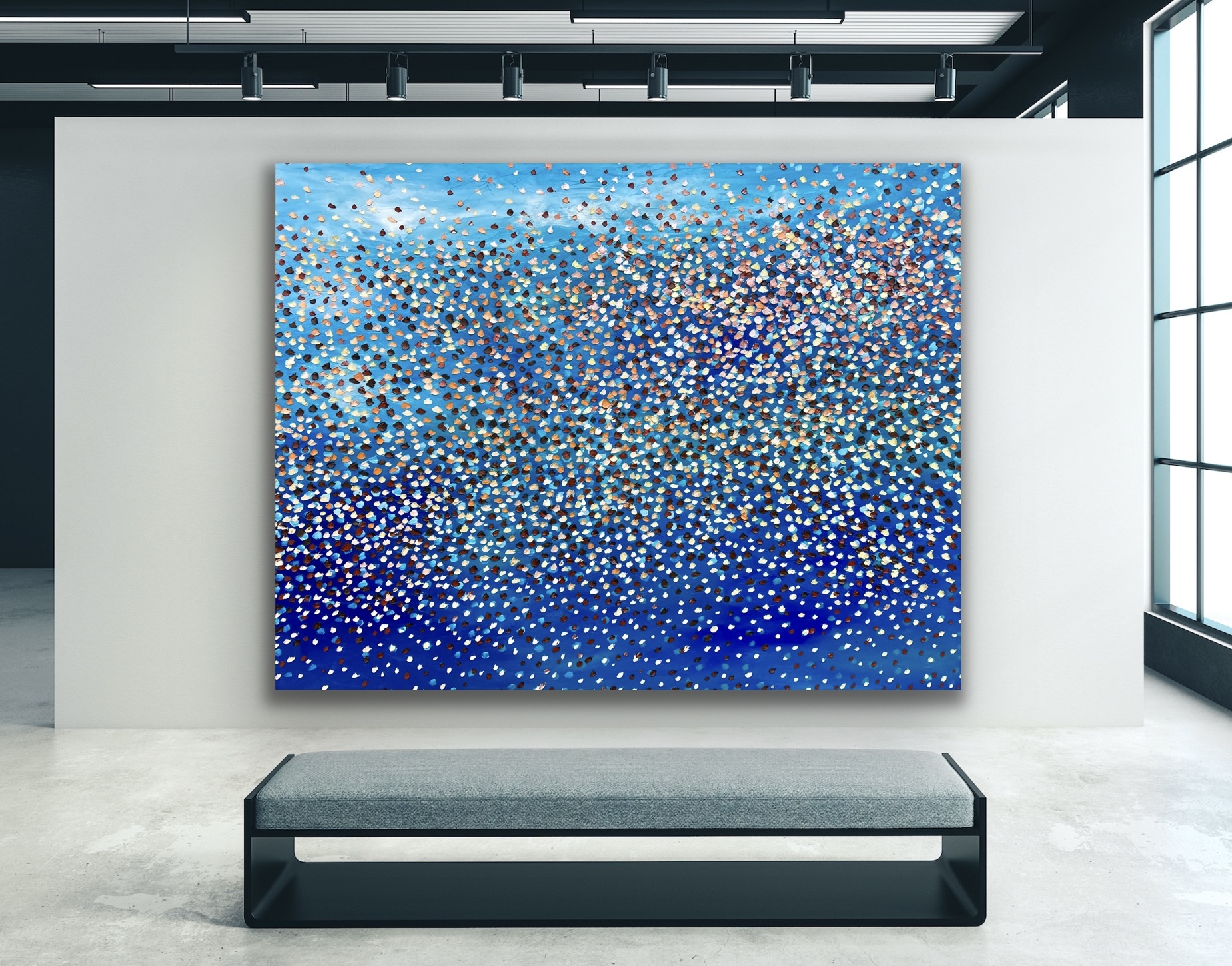 Blue Sapphires by Theo Papathomas – Â a beautiful veil of Petals over the sea swept by the winds creating an explosion of fireworks lighting the whole sky. Petals becoming like precious sapphires lighting up the whole sky over the various blues of the sea. Beautiful warm and cool colours of petals flying in the wind falling over the seascape creating this bouquet of colours. Petals weeping onto the sea creating this beautiful veil of colours covering the whole seascape . A composition of colours and rhythms of petals like stars dancing over the sea. A very peaceful and tranquil painting with so much depth . This painting is painted on linen with a brush and a pallet knife with thick oil paints and lots of layers of paint with a very textured background. The painting is very textured and thickly painted .The painting is signed and dated 2021 at the back and comes with a certificate of authenticity.