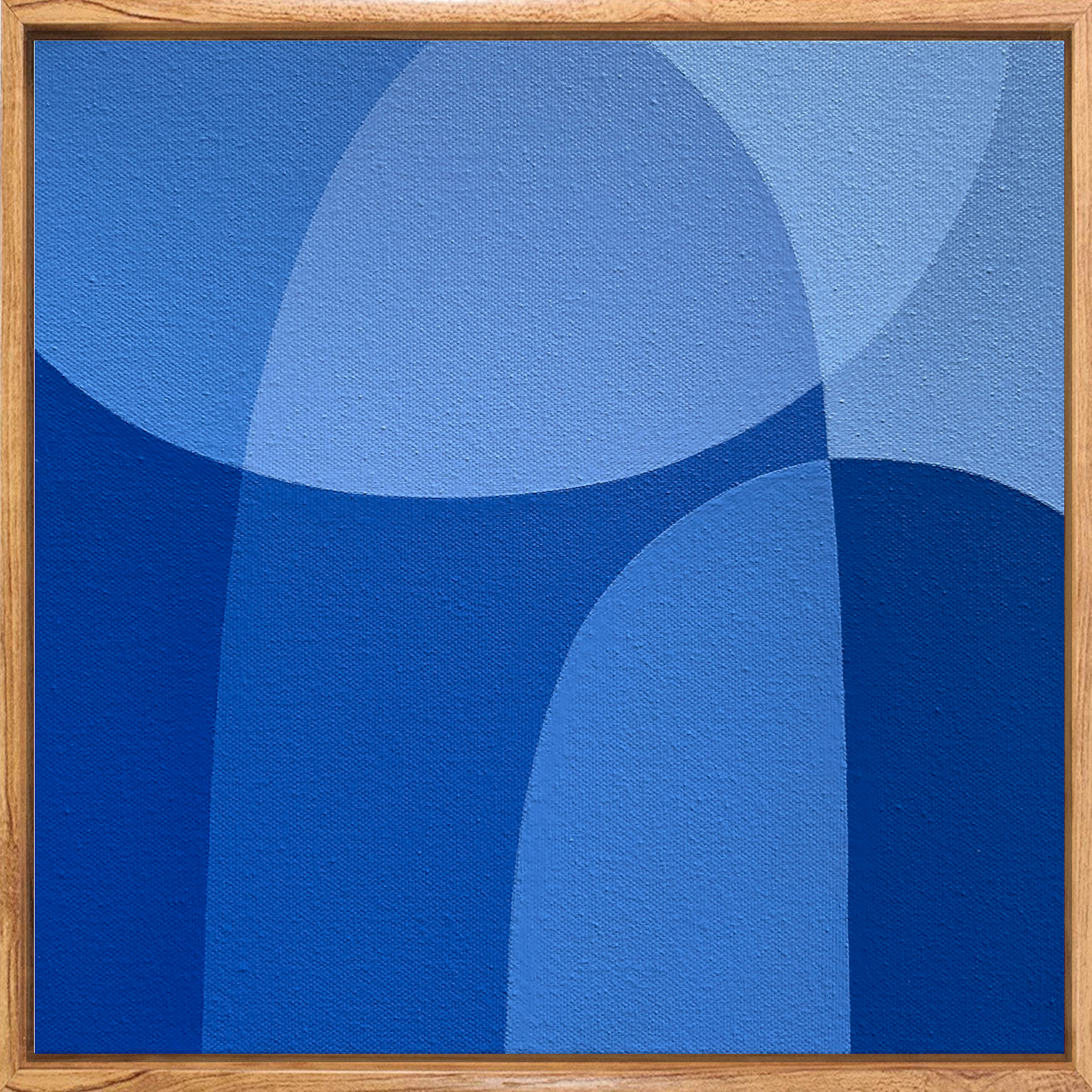 Blue Shadows III is part of Charlotte’s Shadowscapes series and continues her exploration of ideas of transparency and solidity. Inspired by stylised forms from nature, Charlotte embraces her distinctive, hard-edged abstract style, overlapping shapes and juxtaposing vibrant colours to achieve a sense of luminosity and equilibrium.