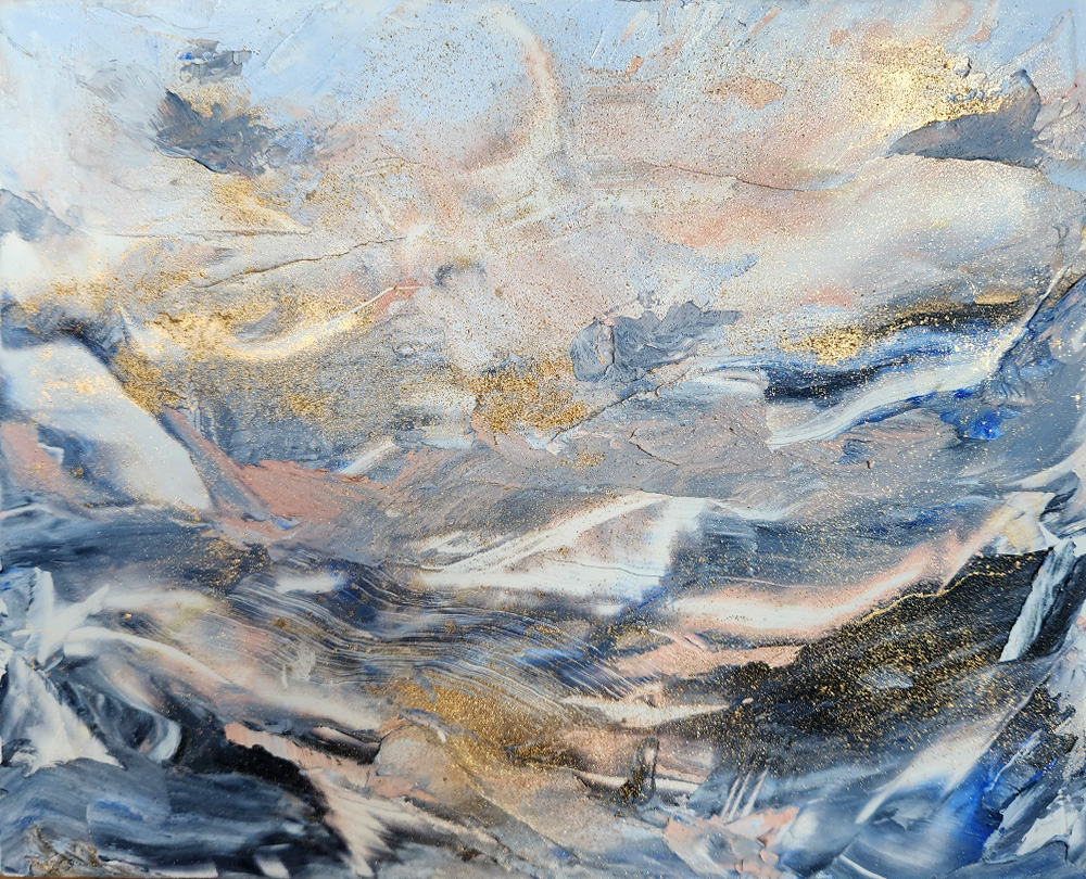 A mini sized original artwork inspired by the Australian blue sky above, and the ebb and flow of our ocean tides, flowing and crashing, changing and growing.