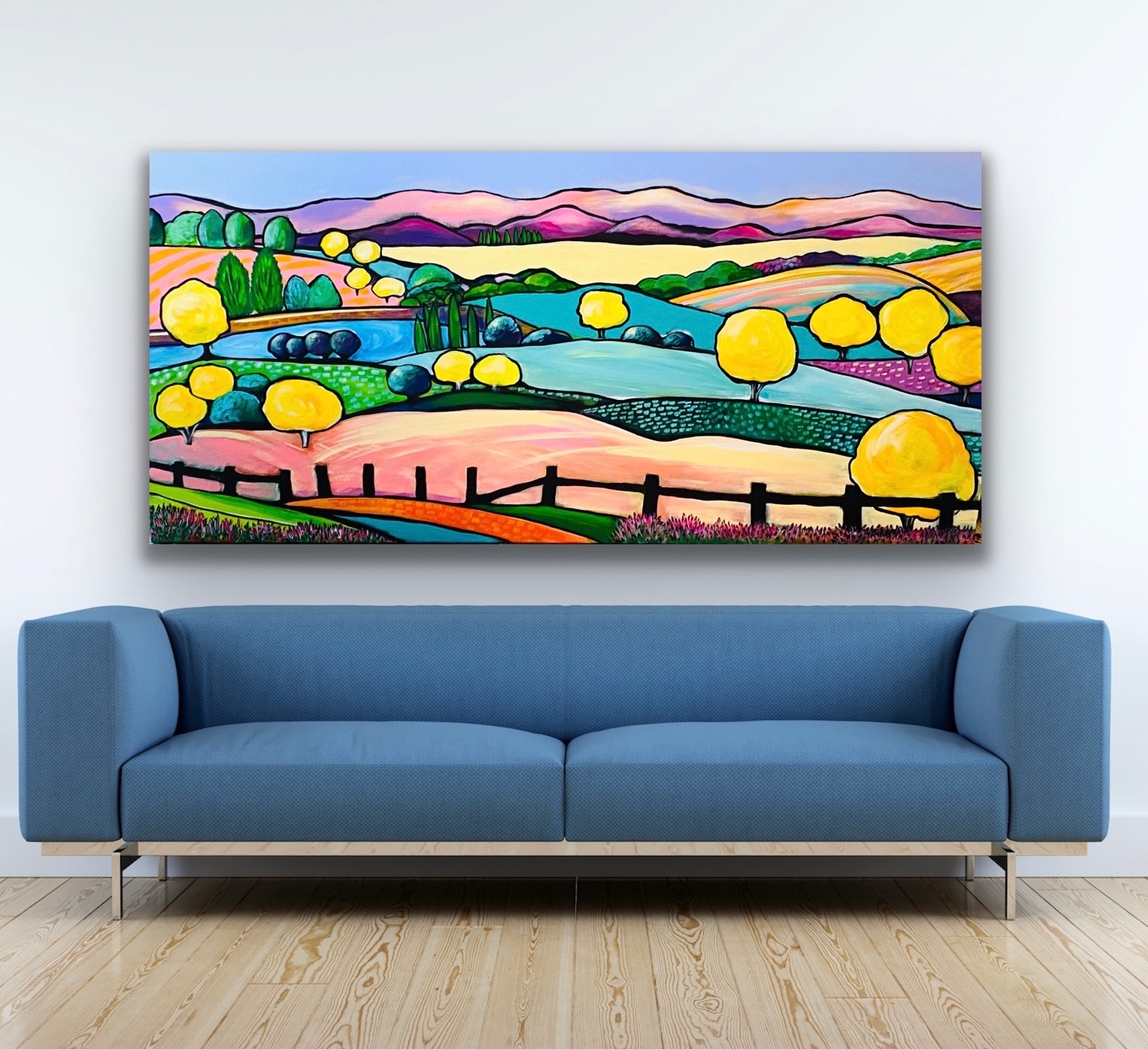 An original, large, contemporary, modern landscape inspired by wattle country just outside of Brisbane. I have owned acreage where the surrounding rolling hills were covered in wattle during winter. You will never be in doubt which trees are wattle because they all are a stand out at this time of year.