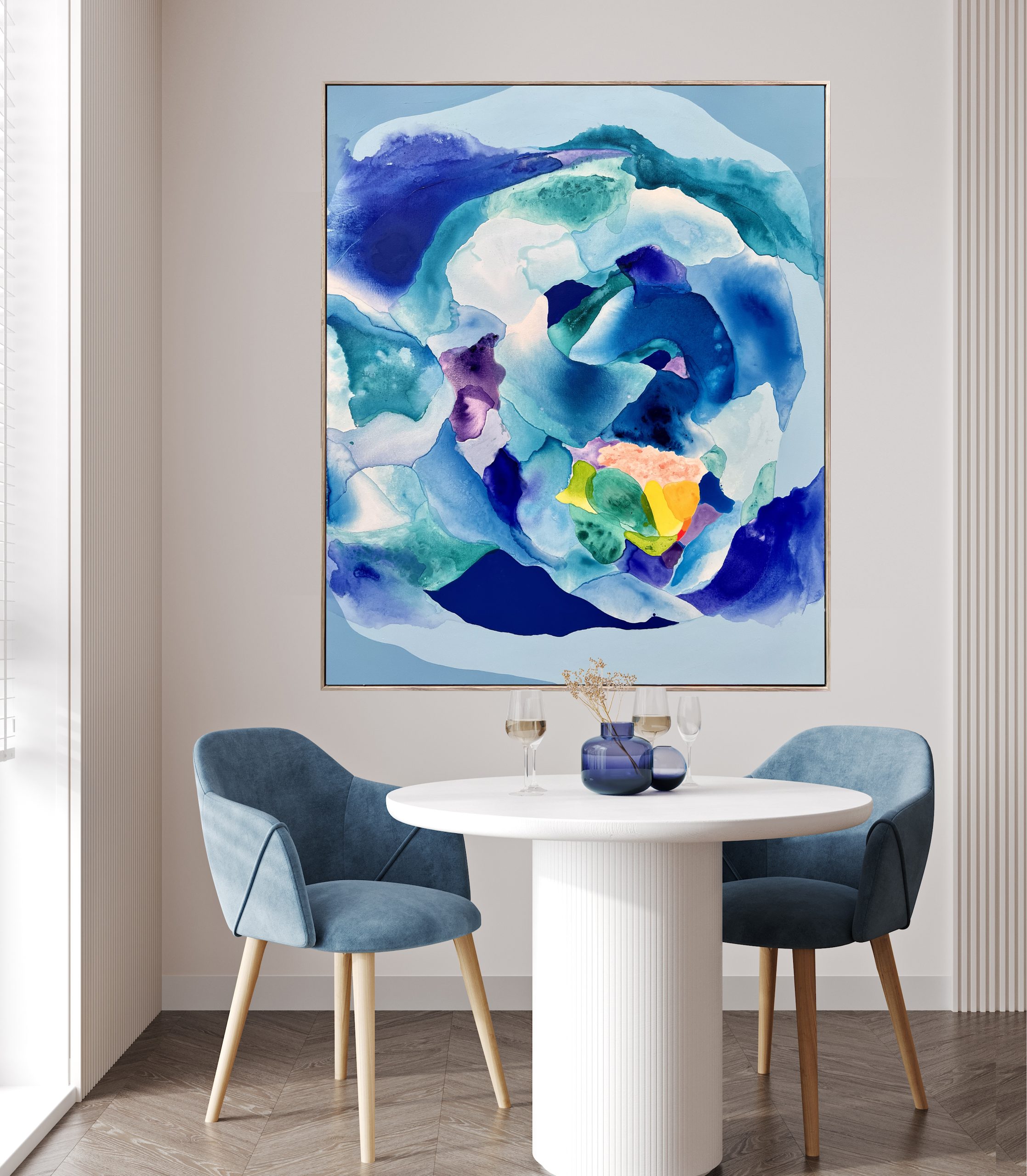 The random, unpredictable swirls of coral shapes and hues drift through my inner creative thoughts and onto canvas – they capture what little worlds and pockets of the ocean might look like. The abstract fluidity of the coral and water is depicted through the curves in the acrylic and layers of colour build the worlds that I imagine. The organic shapes of the coral envelope and caress each other, coalescing harmoniously to create a magical structure of reef.”