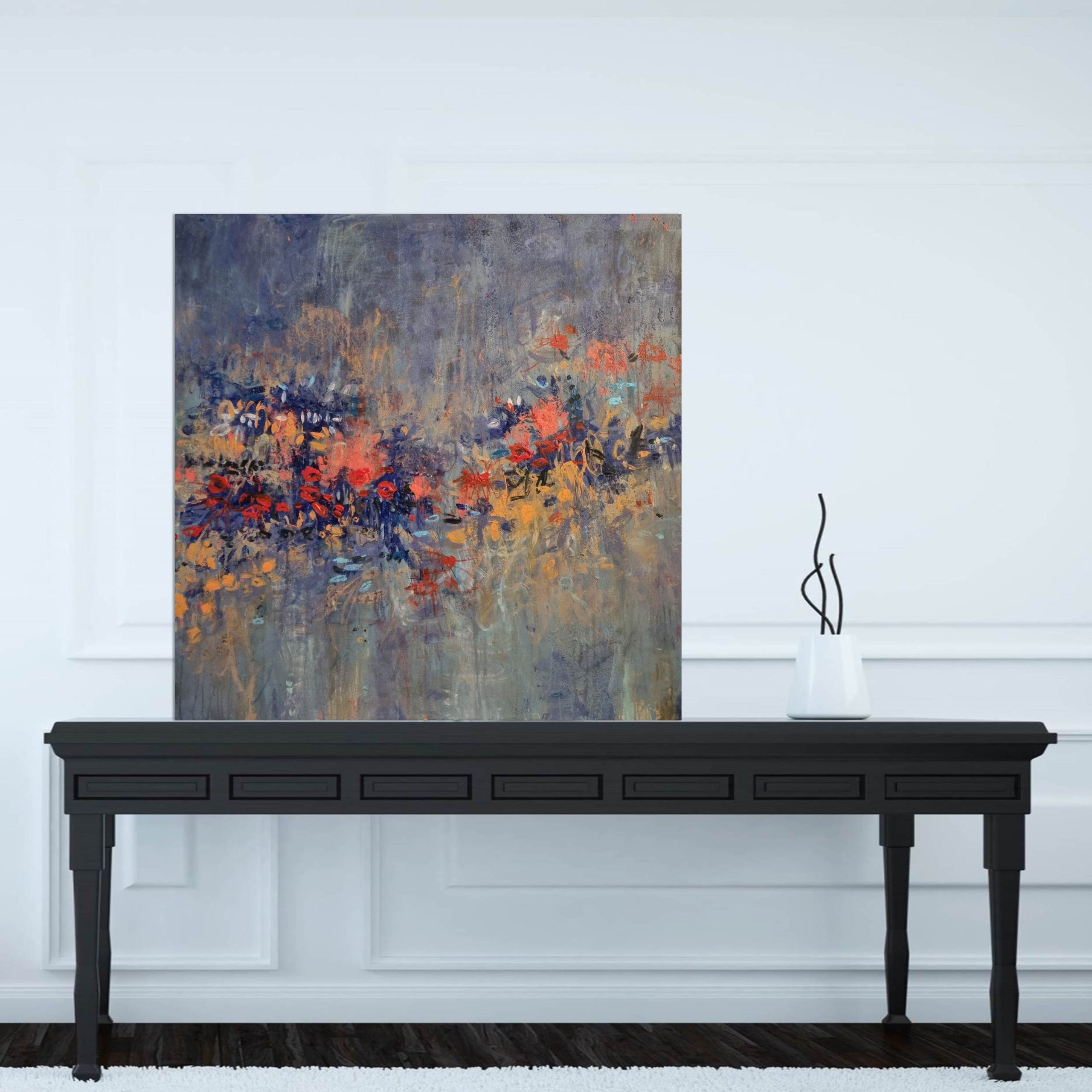 This painting is finished with a modern soft satin protective finish and matte white edges. It’s feel within a room is dynamic and decorative, yet holds a grounding and calming effect, sure to make an appealing feature, at home equally in a domestic interior or corporate space.