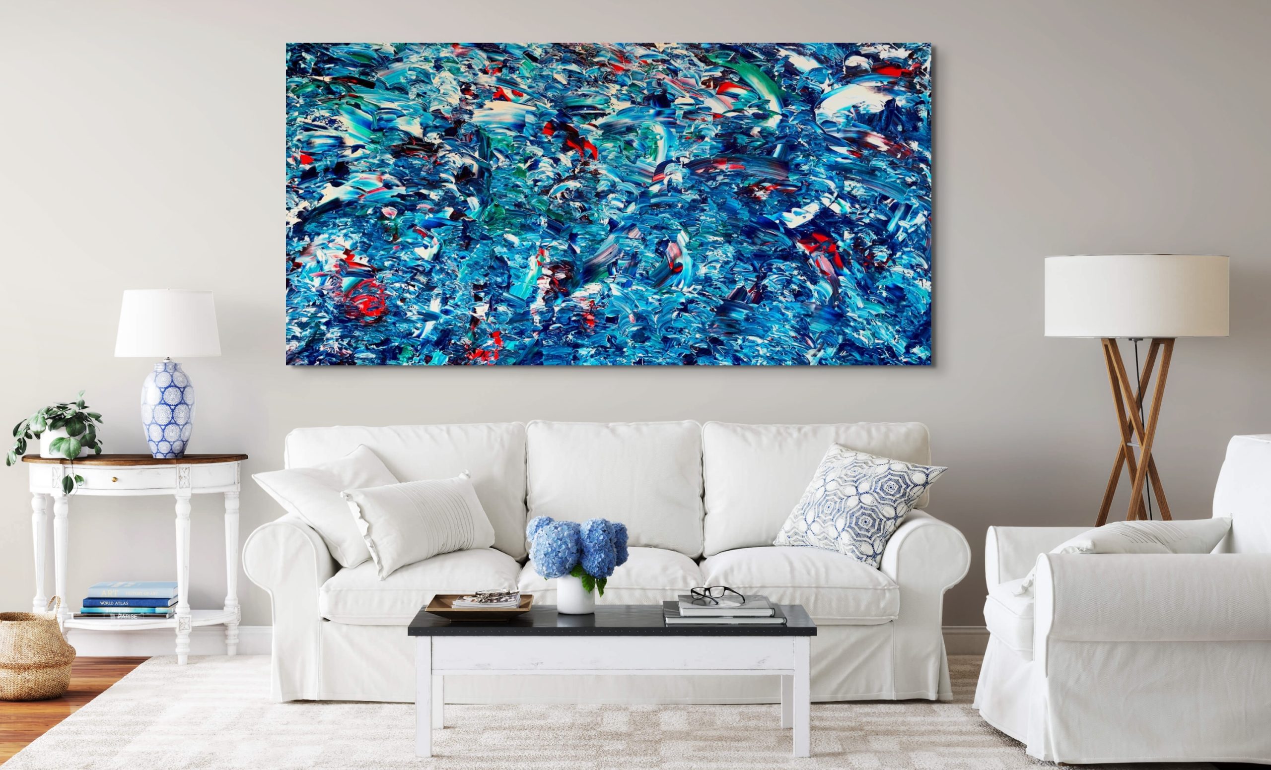 Blue Turbulence by Estelle Asmodelle – This artwork is an emotional exploration of the idea of seeing blue, like the ocean turbulent and powerful, but it is with emotions not the sea we are seeing here. The work is in the style of abstract expressionism.