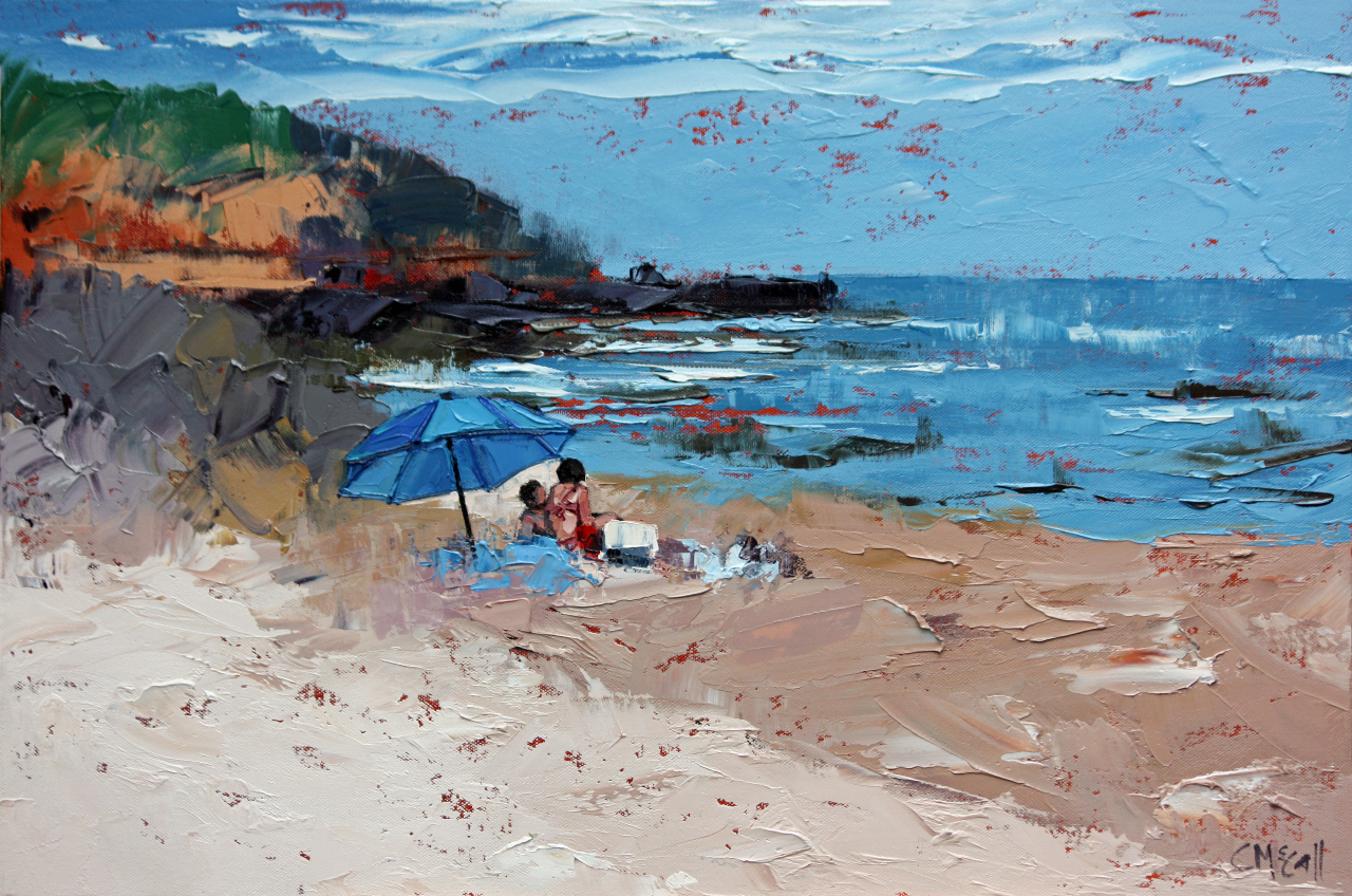 Celebrating memories of the beach and blue umbrellas, this work has been painted with a palette knife to create bold texture, movement and colour.