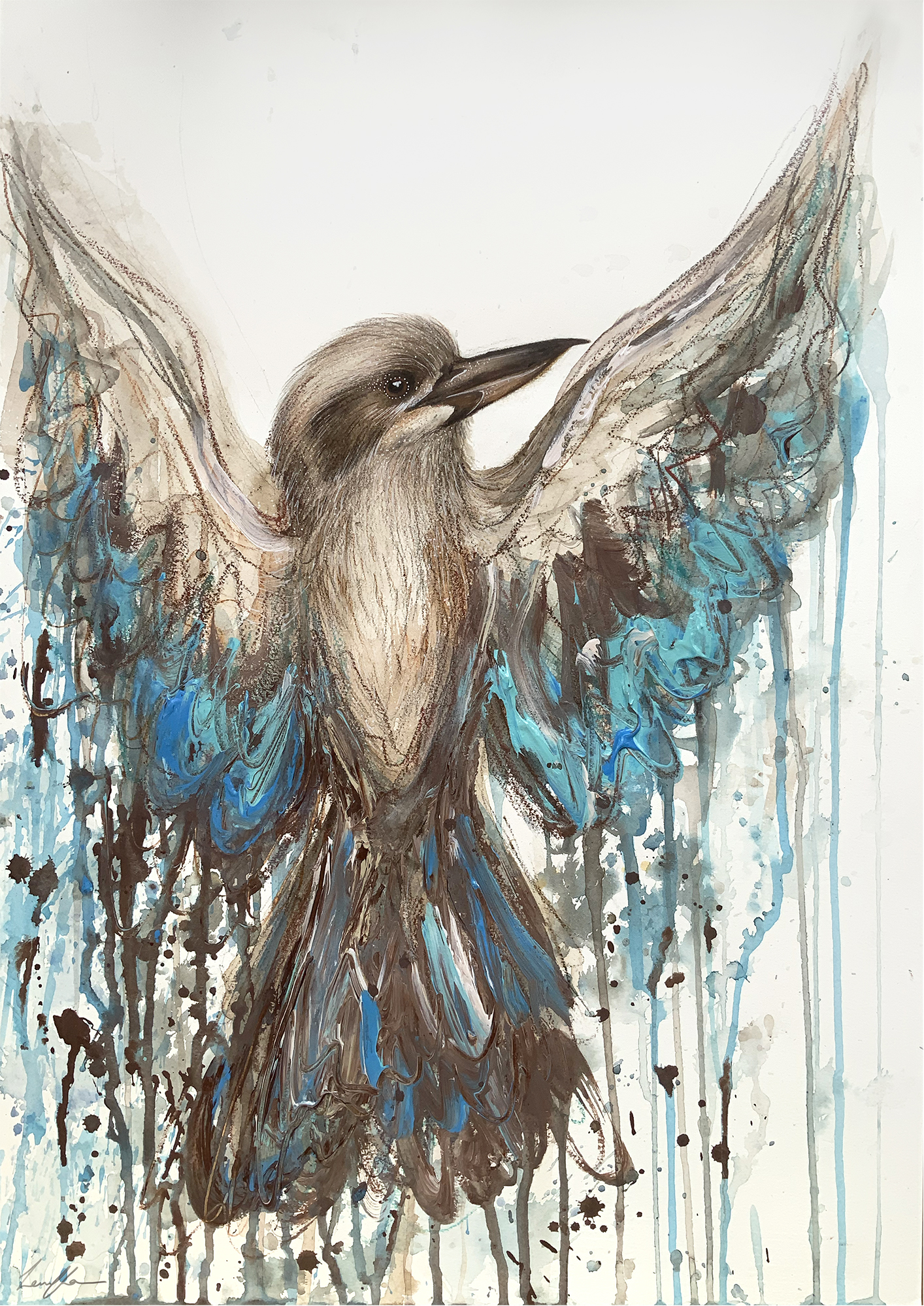A watercolour & mixed media painting of a flying Australian blue winged kookaburra by Sydney artist Leni Kae from her “Animal Spirit” series. Created on A2 300gsm size paper using pencil, watercolour, ink and acrylic paint. Tones of browns and blues. Perfect affordable artwork for art collectors, animal lovers, or a unique gift for bird lovers.