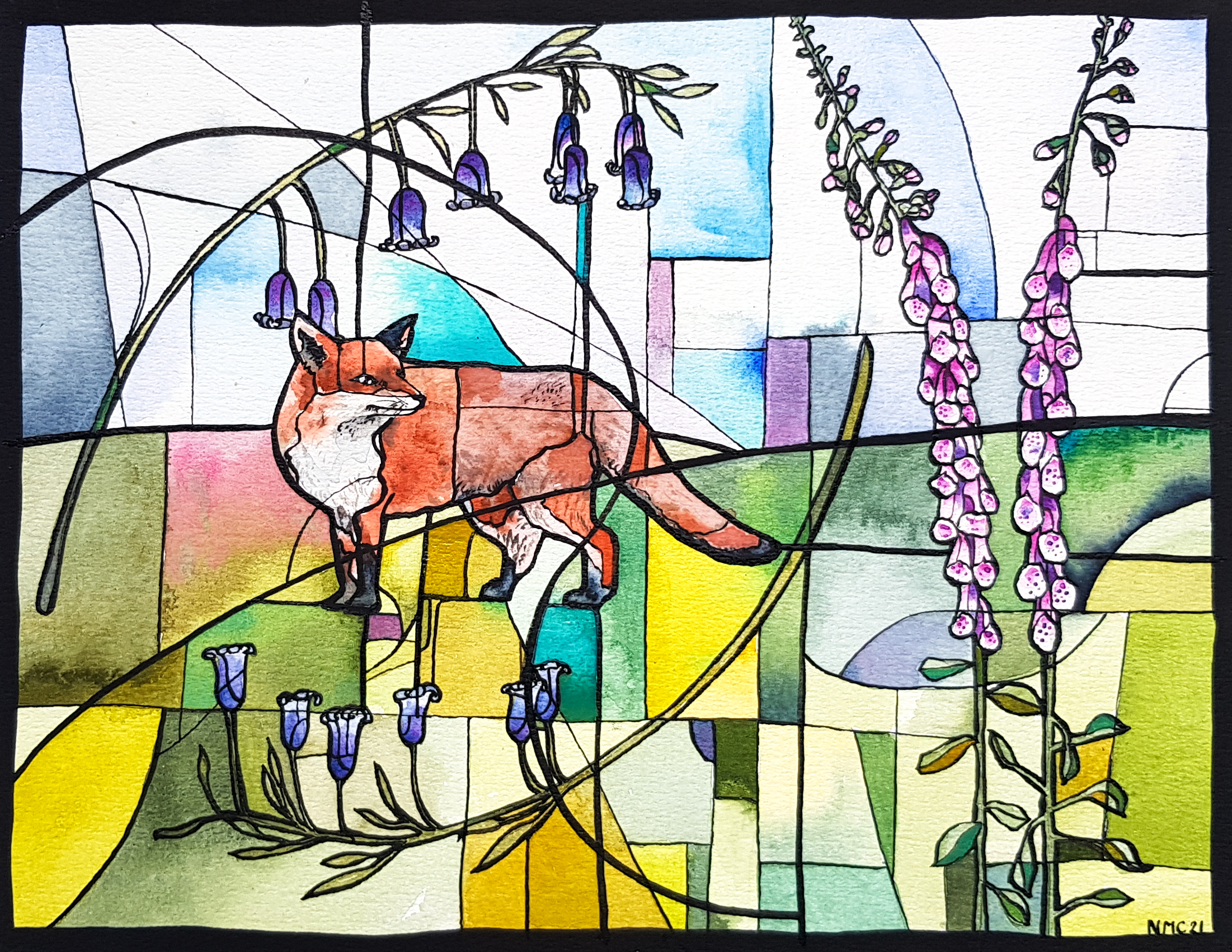 This painting plays with colour and tone with rich watercolour washes all held together with black ink lines. All the visual elements are pared down to geometric shapes similar to a stained glass design and the nature of watercolour lets the light shine through. Painted on heavily textured watercolour paper the whole painting has a tactility to it.