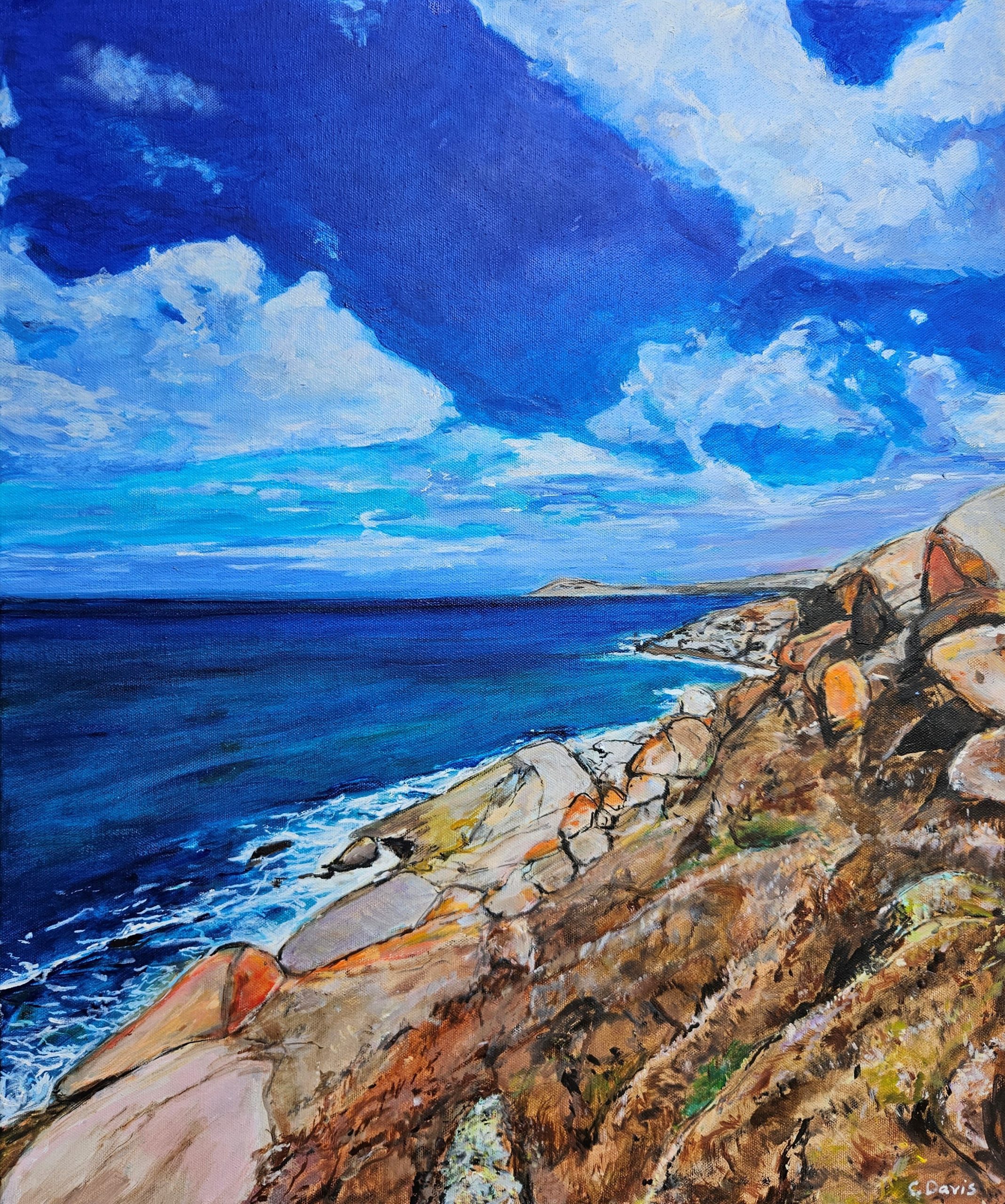 This oil painting was created from a reference photo I captured while going for a walk around Granite Island which is an island off Victor Harbor, South Australia. The bluff which is a hill southwest of Victor Harbor can be seen in the distance.