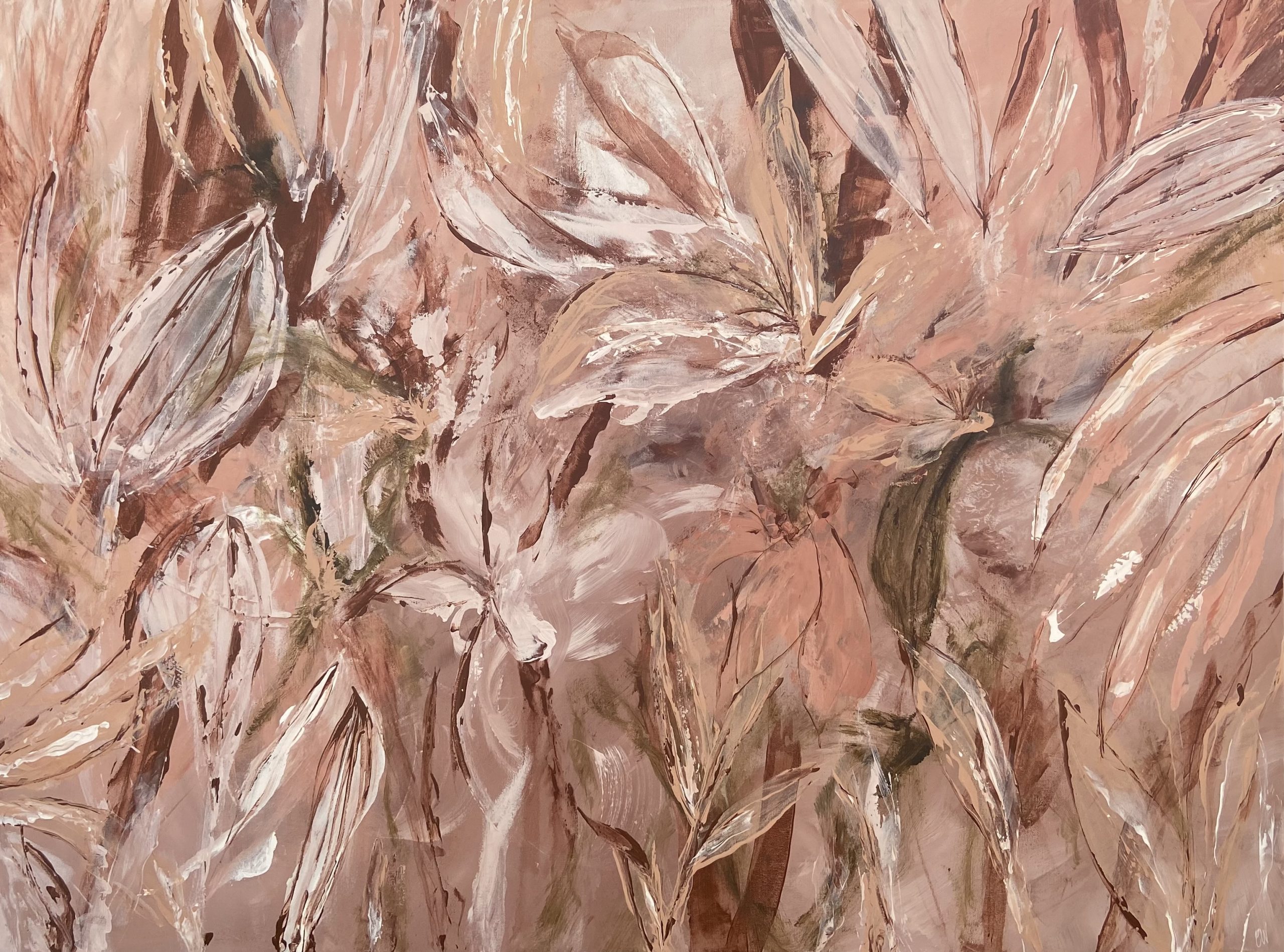 Blush Tropics by Carrie Welsh is a beautiful abstract botanical painting. 121.9 x 91.4 cm. Acrylic on canvas, ready to hang. Frame not included.