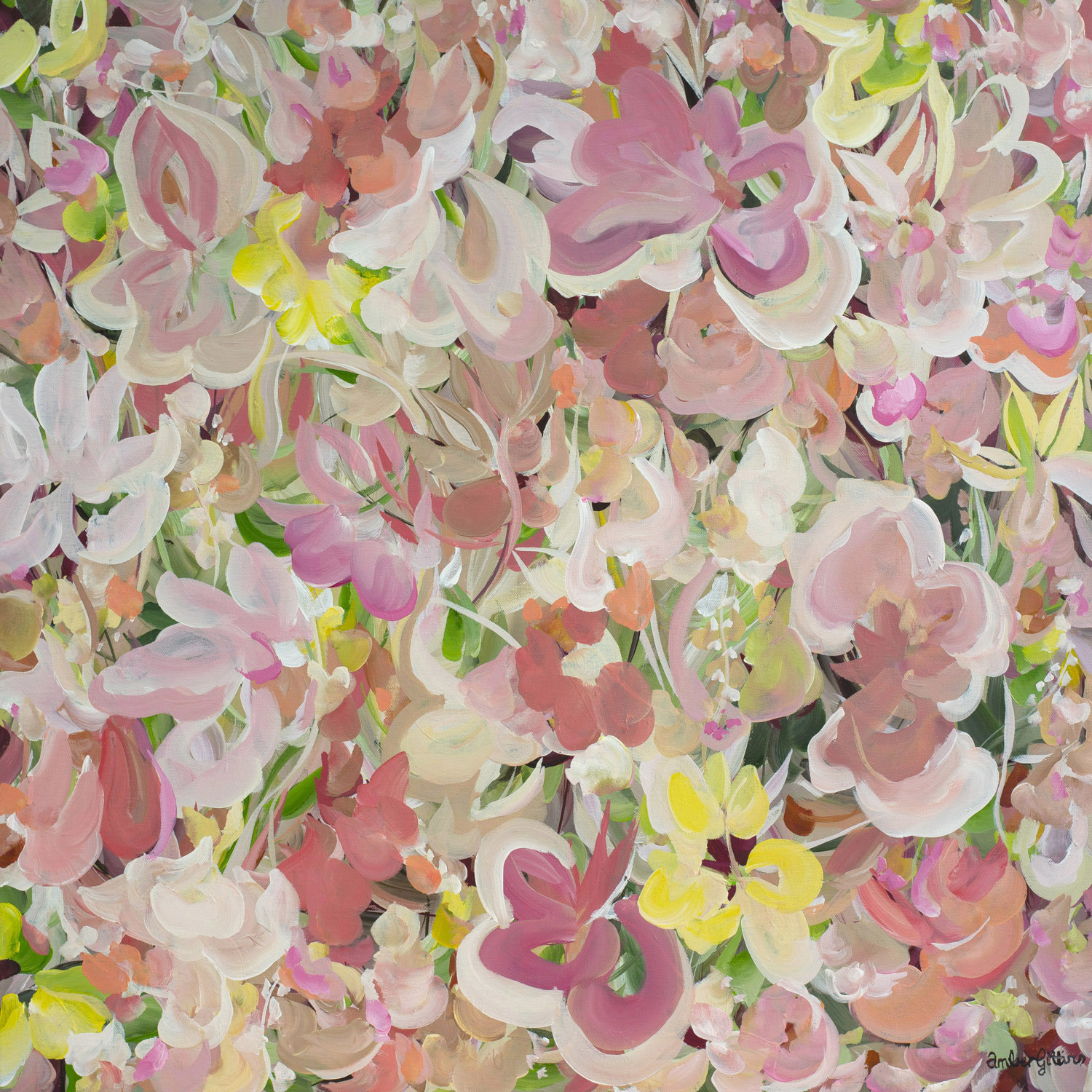 A calm pink flower landscape painting with movement and flowing organic floral shapes.