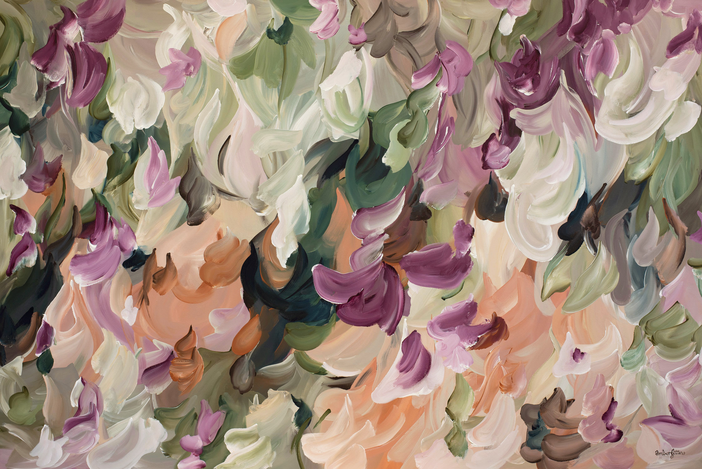 Abstract Botanical artist Amber Gittins has a love for colour and movement in her paintings. She uses acrylics as she loves the fast drying time of acrylic paints, which helps in the creation of the natural flowing movement that give her that signature style. Her colour palettes are ever changing with each piece, which can also coincide with her current mood and also varies depending on the time of year and season she is in. Nature is her constant inspiration and she loves to explore outside and take long walks in nature regularly. Amber’s artworks invoke joy and calmness within the viewer and have created a modern unique addition into collectors homes worldwide.