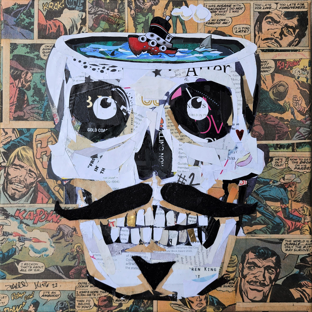 The background elements have been taken from vintage comic books. The skull and details are made from various books, brochures, magazines and junk mail. The facial hair is made from felt which gives it a raised furry texture. A couple of metallic gold teeth are included which pick up the light on varying angles. The boat was created in photoshop, printed out on glossy photo paper and added to the artwork. All bits are torn, cut and reassembled to create this heavily textured one of a kind original artwork. The layering of various paper creates a nice textural artwork.