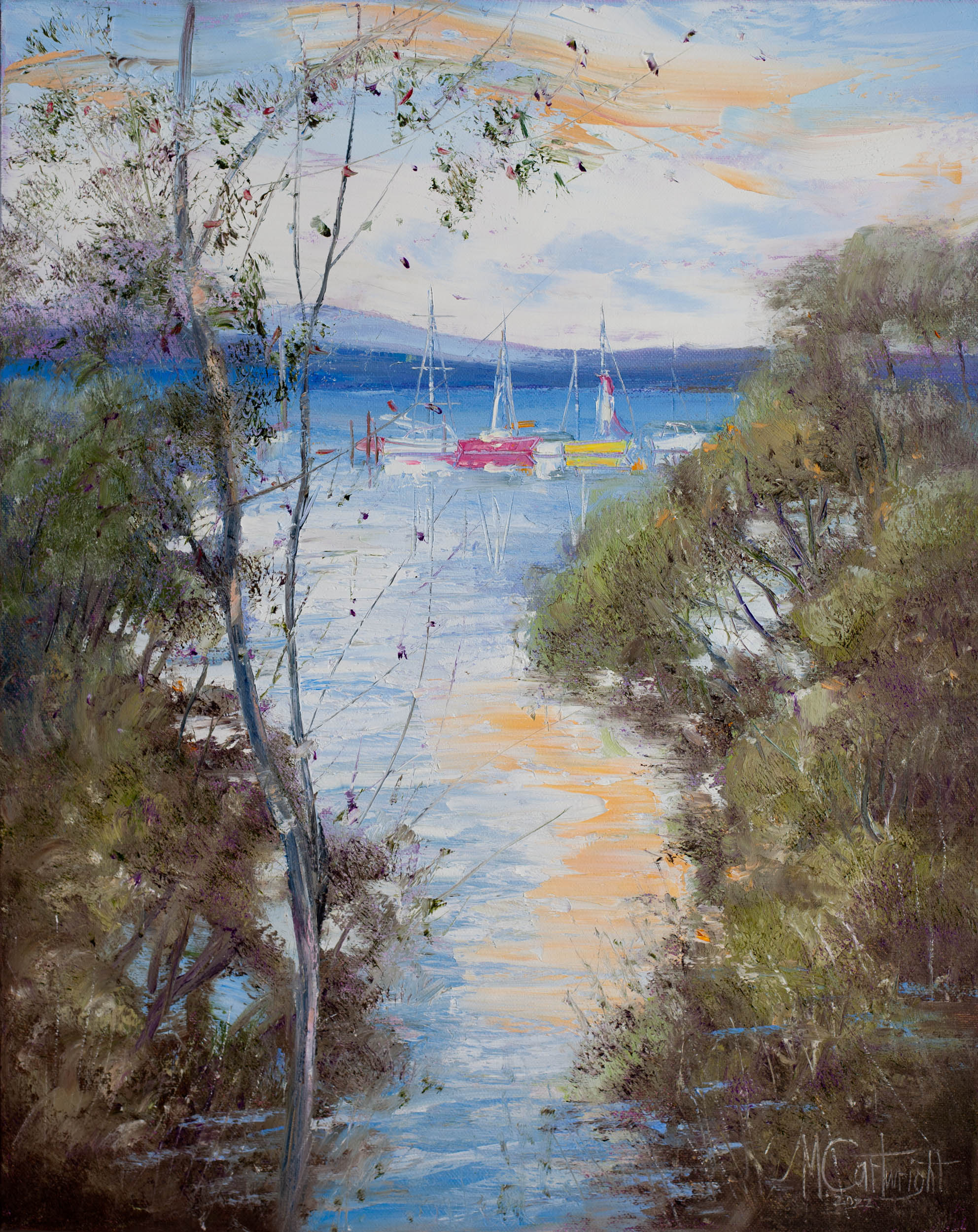 The location is the beautiful Denmark River near the south coast of Western Australia. I was inspired by the riverboats between the paperbark trees and their colorful reflections in the water below. A textured oil painting spontaneously rendered using a palette knife.