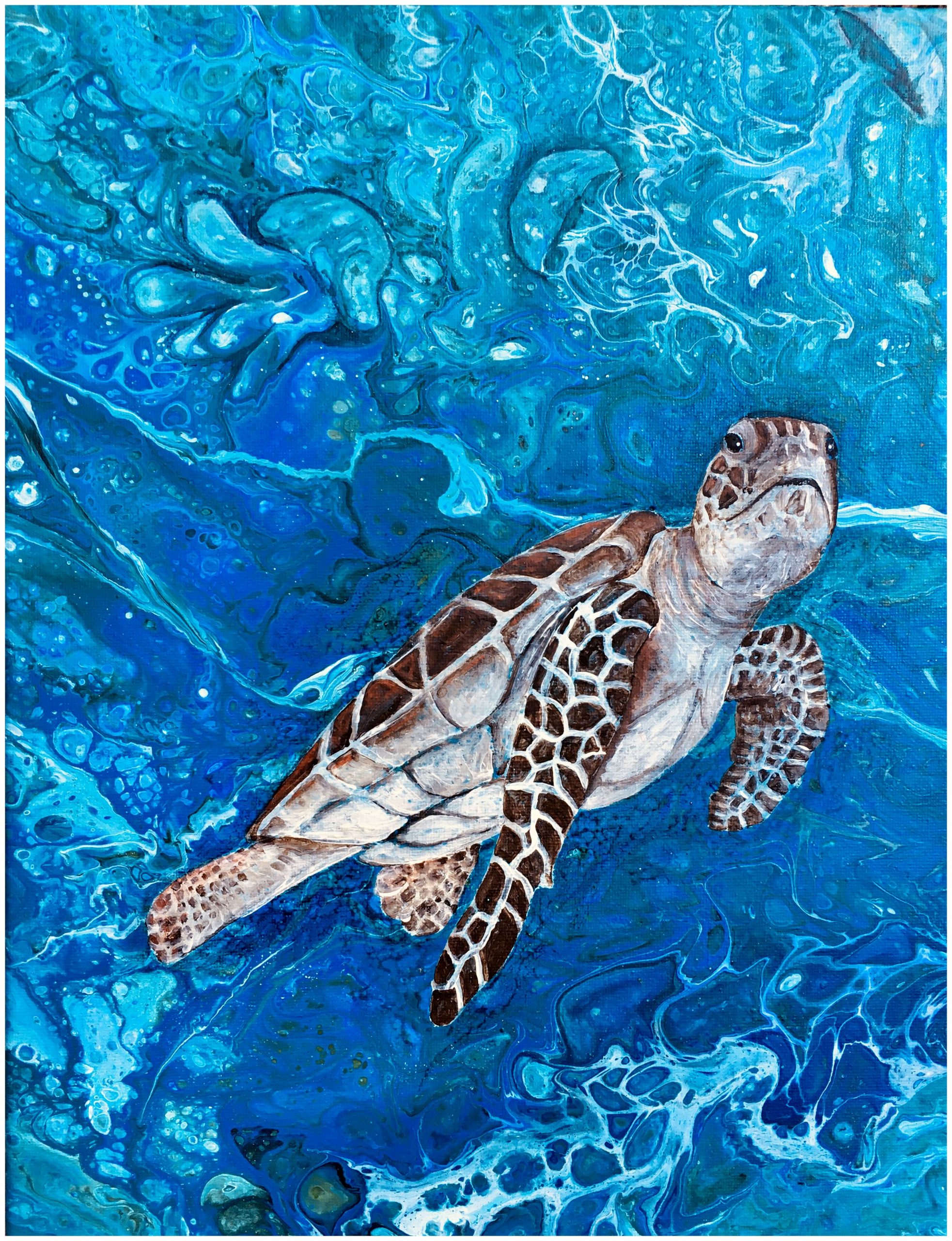 This original painting started with a fluid acrylic pour with the colours of the ocean on an 30cm x 40cm stretched canvas. After the pour had completely dried, it was embellished with a lone swimming turtle.who is checking out several jellyfish swimming overhead. Sea Turtle love Jellyfish as their favourite meal. But sadly quite often they suffer because the mistake disposed plastic bags for Jellyfish.