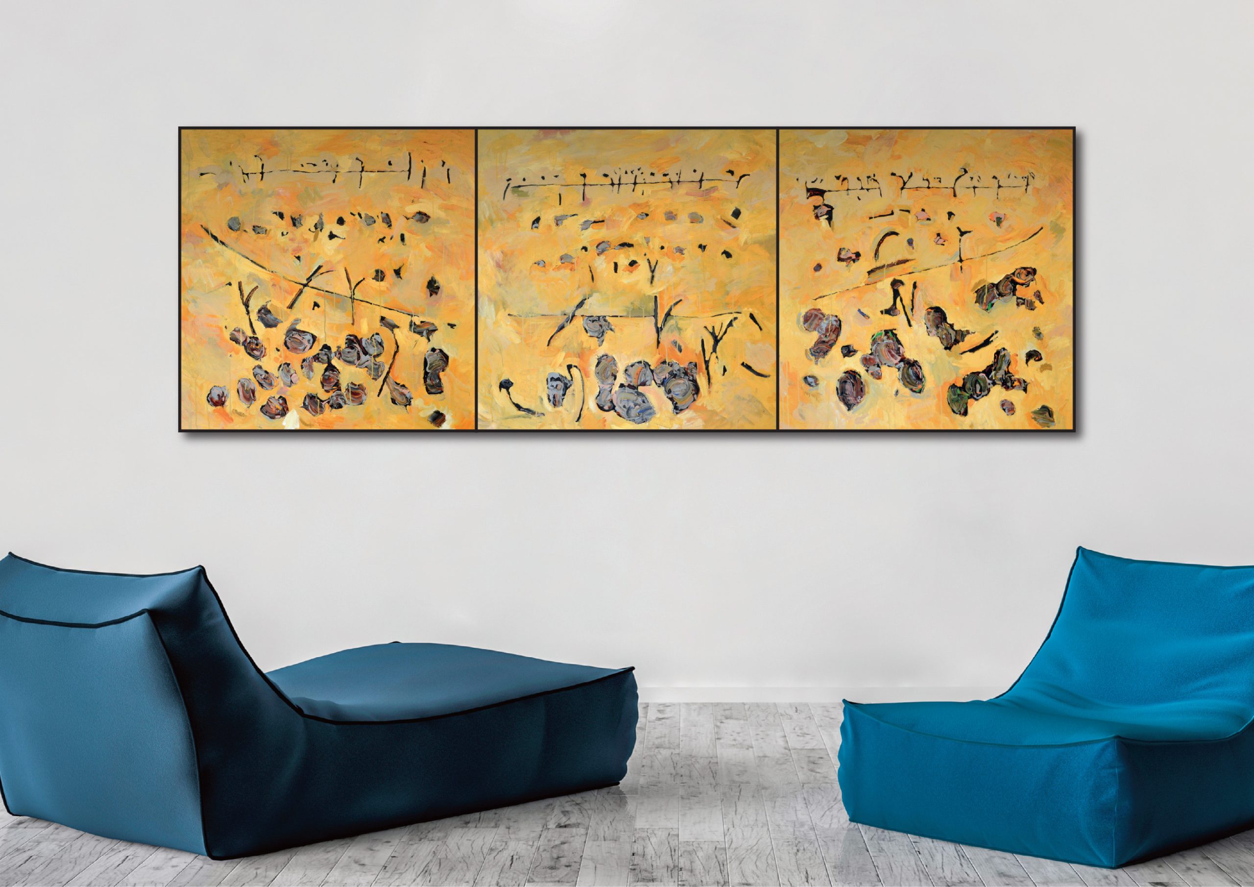 This painting is a triptych of three individually framed panels, each 101x101cm.