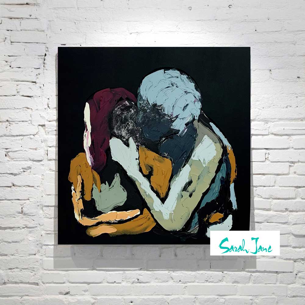 Remember that first kiss. Oh the butterflies! Be allured into a stylish world of love with Body Bloom IV. A black canvas painting figurative couple kissing. By Australian Artist Sarah Jane.