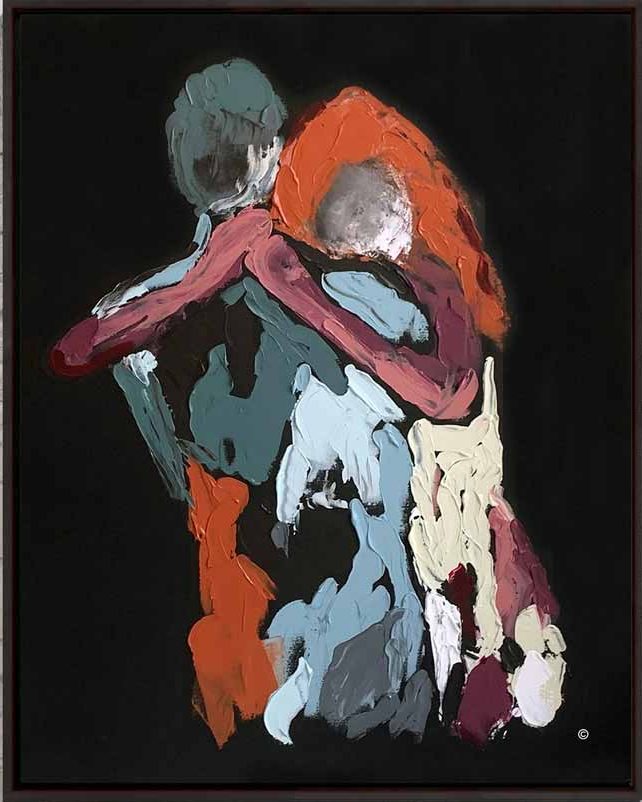 Feel the comfort of a warm hug with Body Bloom VIII. A black canvas painting figurative couple hugging. By Australian Artist Sarah Jane.