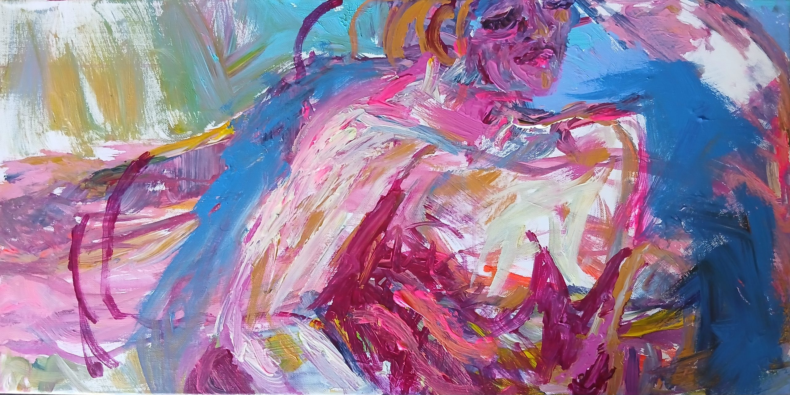 Body Dreaming is an expressive, dreamlike work where the figure dissolves into landscape and atmosphere. Sweeping strokes of pinks, magentas, and blues create a surface alive with texture and energy, capturing the vitality of the body as it expands beyond its edges into a fluid, atmospheric field. Both contemplative and bold, the painting invites viewers into a state where inner and outer worlds converge, offering a striking contemporary piece that balances raw immediacy with poetic depth.