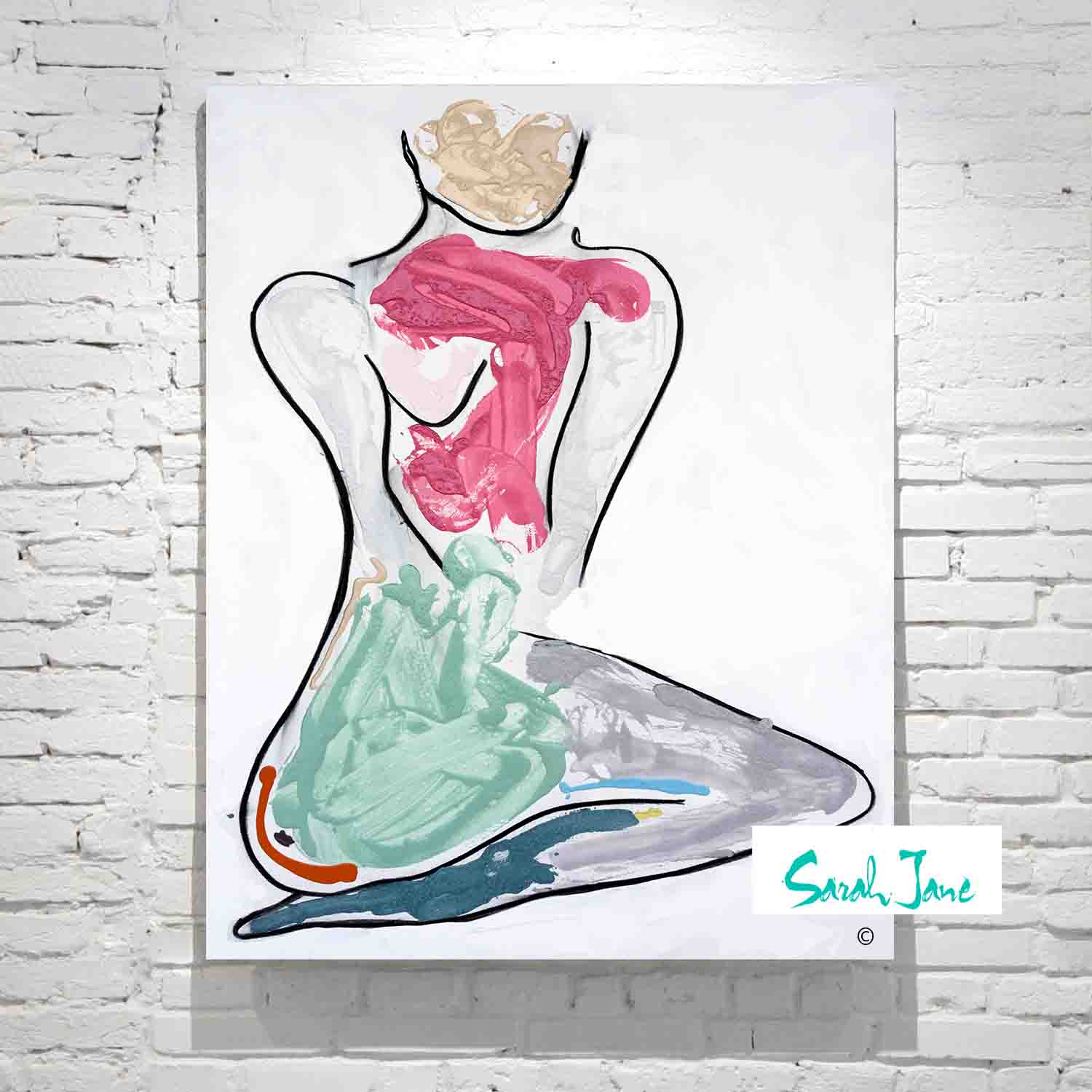 A beautiful healthy glow of energy emanates from Bodyline Bold III. An Abstract Figurative Painting Woman Kneeling with bold colours by Australian Artist Sarah Jane.