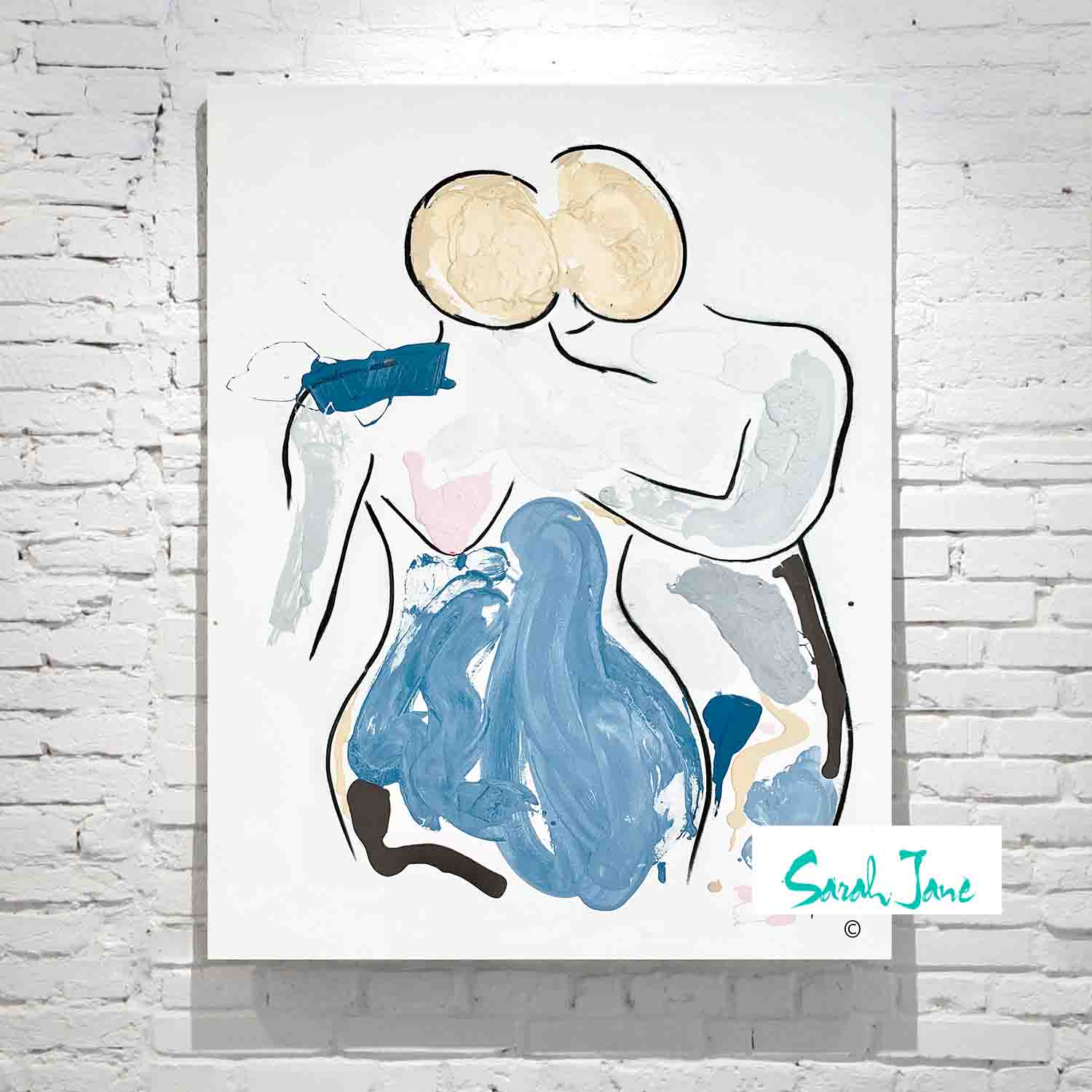 Let your love shine with Bodyline VII. A Modern Figurative Painting Couple in Love. Gentle soft colours inside a charcoal body outline grace this collectors piece of a man standing behind a woman gently holding her in display of love. By Sarah Jane Australian Artist.