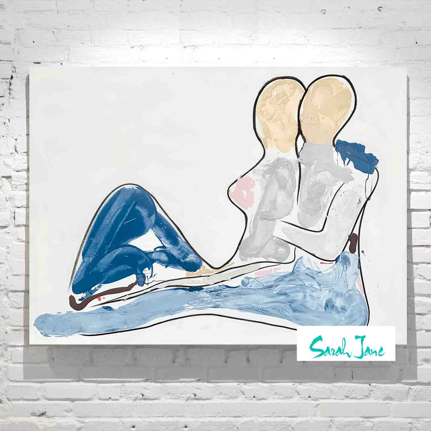 Modern Figurative Painting Couple sitting together hugging – Bodyline X by Australian Artist Sarah Jane is a contemporary painting about the love of a man for a woman. Lose charcoal outline with soft colours internally.