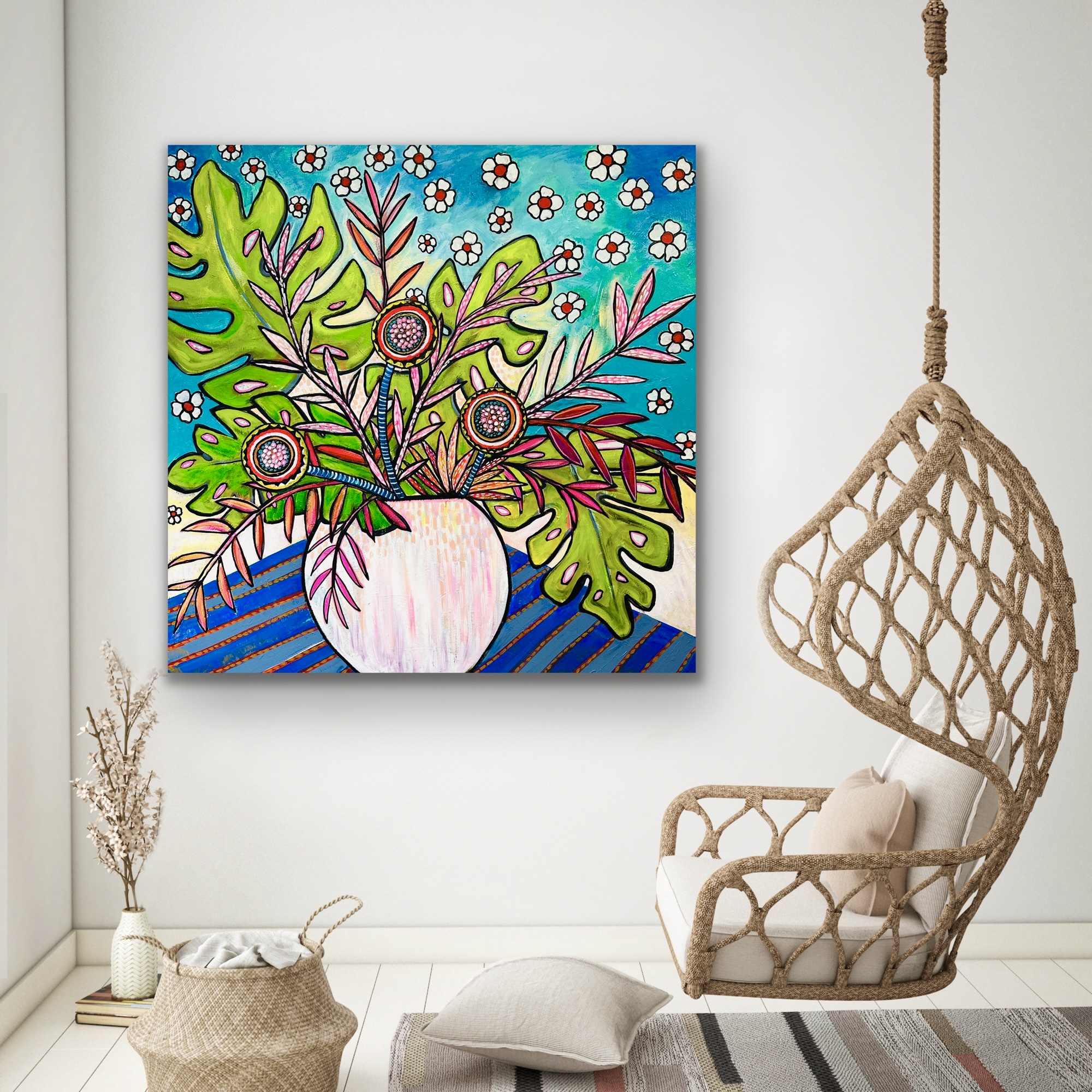 The large shaped leaves of the Tropical Monstera Deliciosa is featured here with ornamental Boho styled beaded decorative pot ornaments lovingly their placement. A backdrop of floral wall art profusion represents life and love.