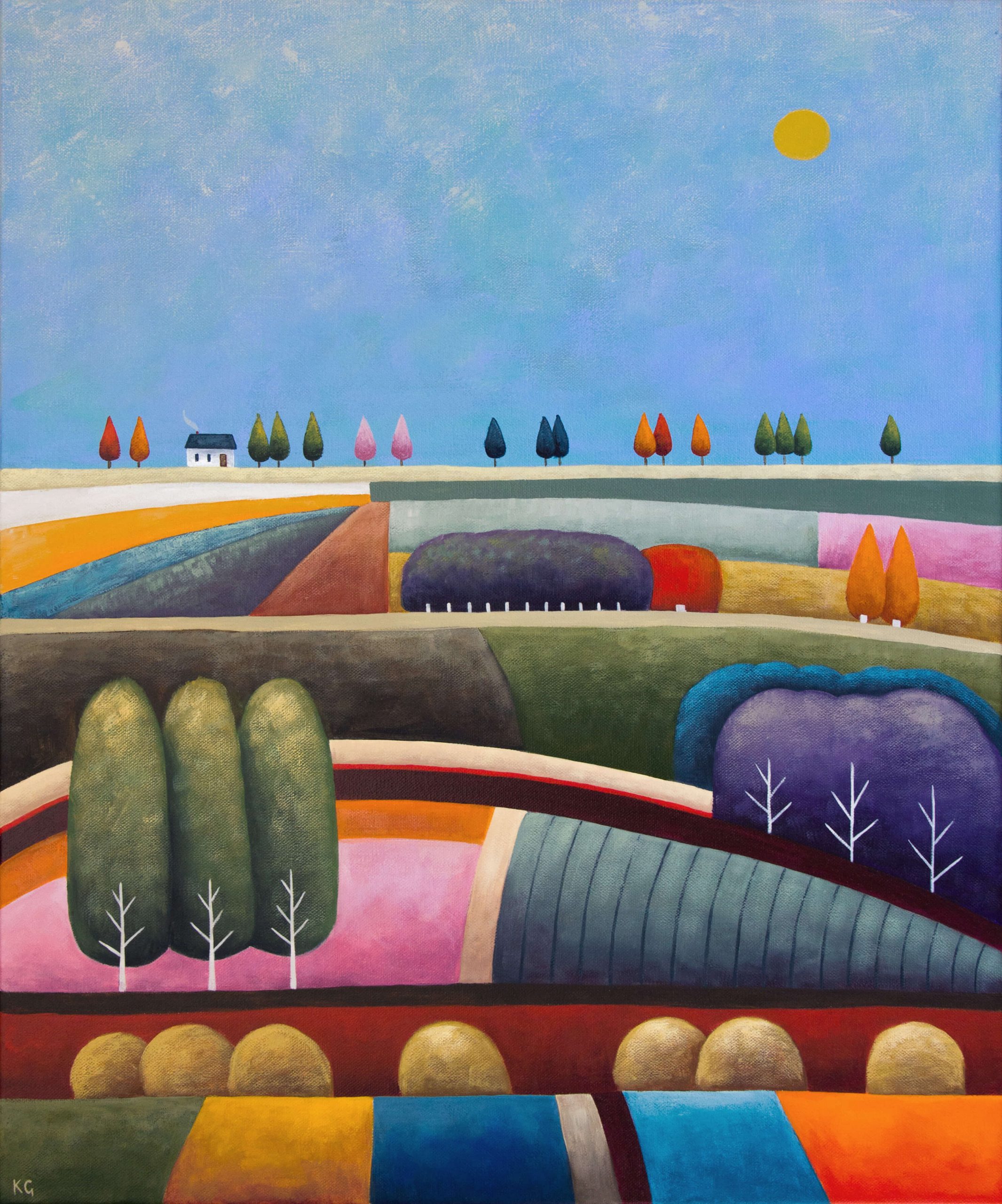 Boho Sun by Kate Graham. This medium landscape is composed of a surreal patchwork of fields and trees, interwoven with stripes. On the horizon are distant trees painted in the main colours of the painting as well as a single house with smoke coming out the chimney. The colour scheme is rich and colourful, a more bohemian palette for a touch of fantasy and whimsy. The painting is warm and cheerful, its intent is to delight and bring the viewer a sense of joy with its cool and warm colours woven together. This piece would make a striking addition to any art collection or be a great way to start a collection, and could fit in the right place in a living room, bedroom, office or study. Painted on quality canvas with hooks and wire on the back, sides painted in a continuance of the composition so no need to frame but would look great in a wooden frame rather than black or white.