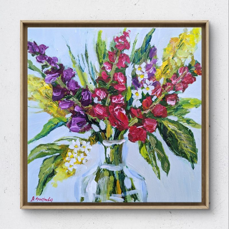 This artwork is painted on professional-grade canvas stretched and sealed with varnish. The canvas has dimensions 152 cm in width by 152 cm in height. The sides are painted in black. As such it does not need a frame.