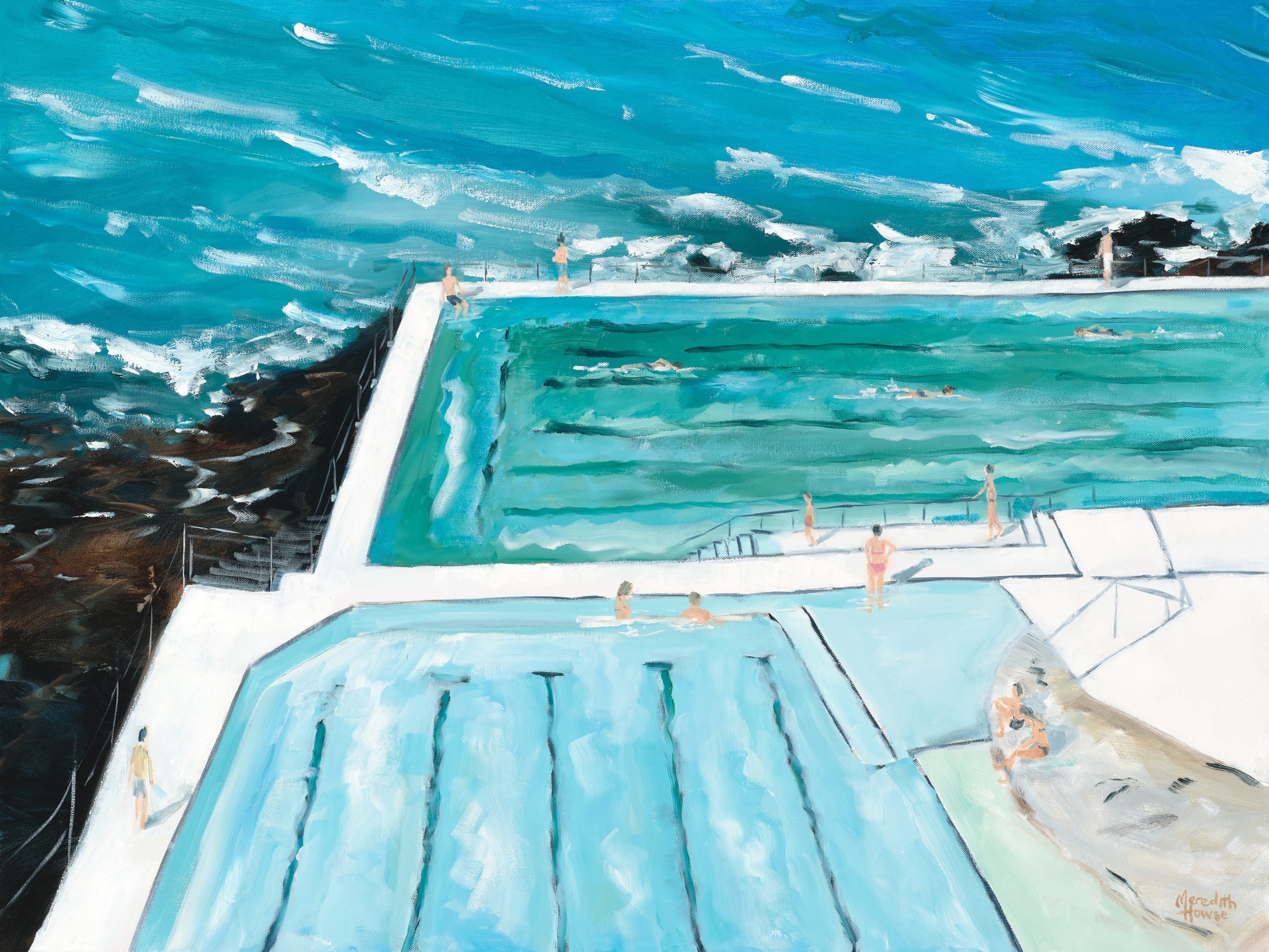 In Bondi Iceburgs Swim, Meredith Howse captures one of Australia’s most iconic coastal scenes—the Bondi ocean pool—with vivid and painterly strokes of colour. The palette constantly shifts for artworks of Bondi, where light aqua mingles with deep sea blues and brilliant turquoise in an ever-changing display shaped by the ocean, sky, and weather.