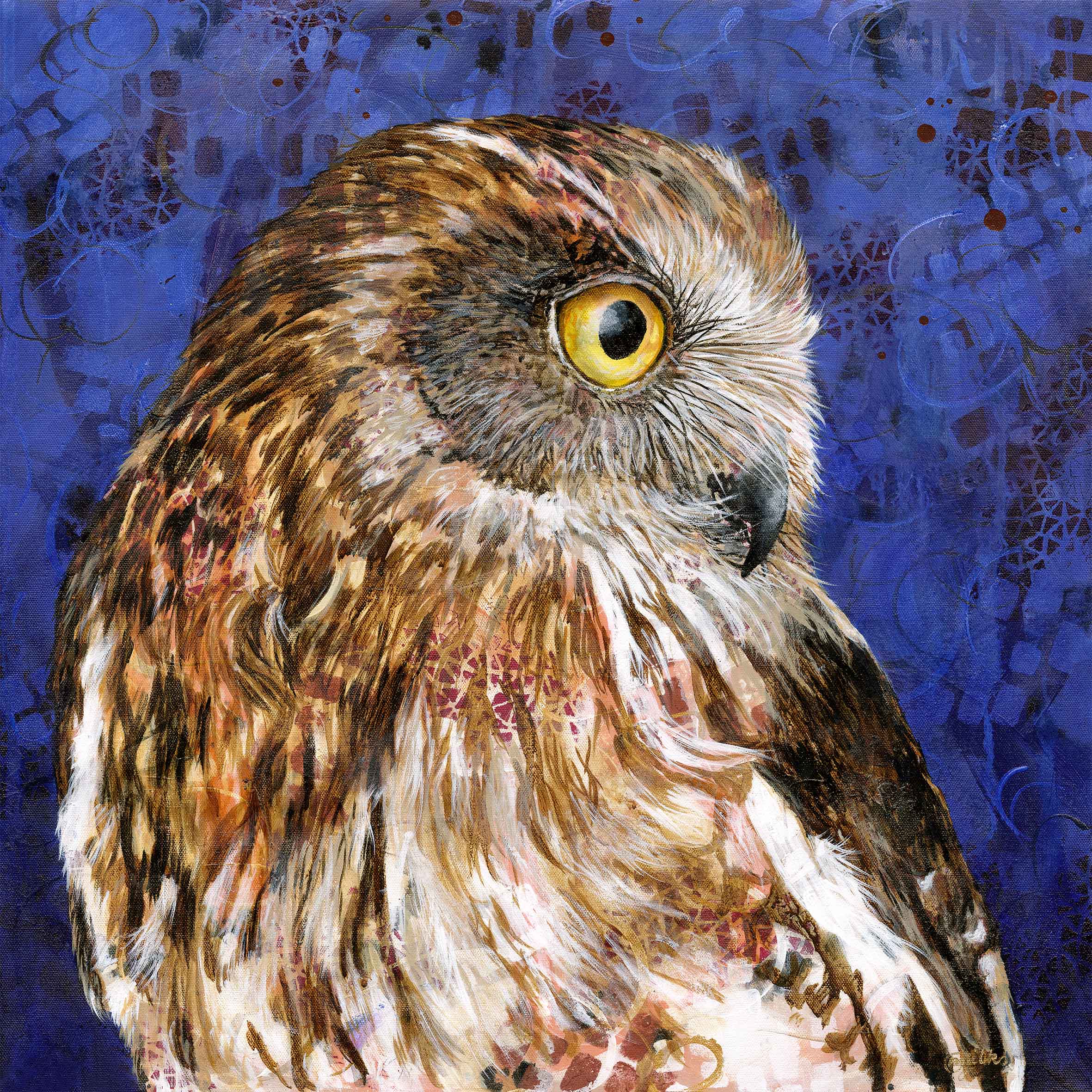Whatever this Boobook owl is staring at, it definitely has it’s full attention! The Southern Boobook, or Mopoke owl, is Australia’s smallest and most common owl species. This print is taken from professional scans of the original acrylic painting and it’s multi layered nature reveals tiny details and unique marks that add complexity to this artwork.