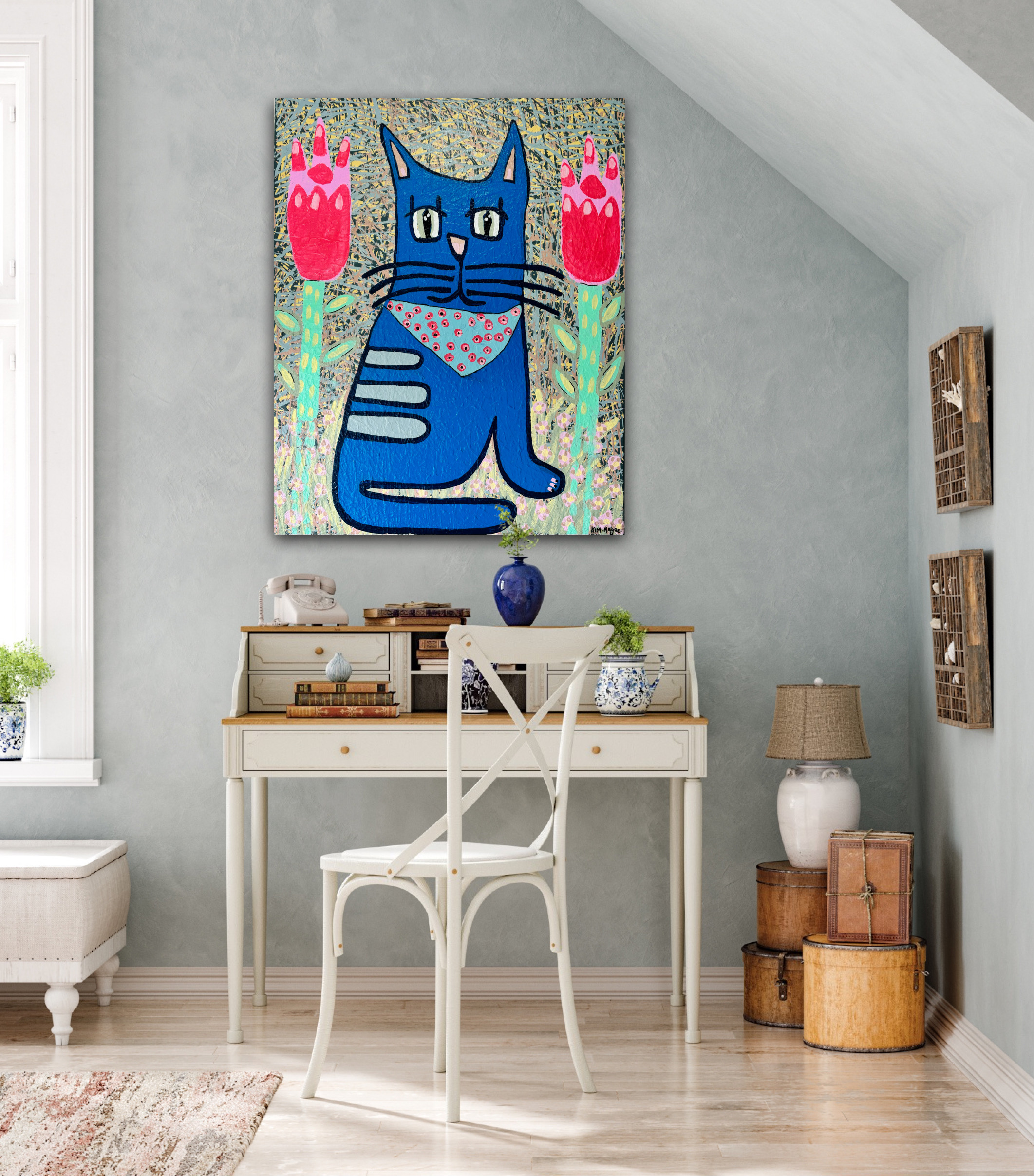 Boot Scooting Cat Painting by Kim Magee is a charming and original piece of art that captures the whimsical essence of a cat The medium-sized canvas, measuring 75cm in length and 60cm in width, features vibrant blue hues in a naïve, outsider, and folk art style. Handmade with acrylic paint, this Australian artwork is signed by the artist and comes with a Certificate of Authenticity. Ready to hang, this unique painting is a perfect addition to any art lover’s collection.